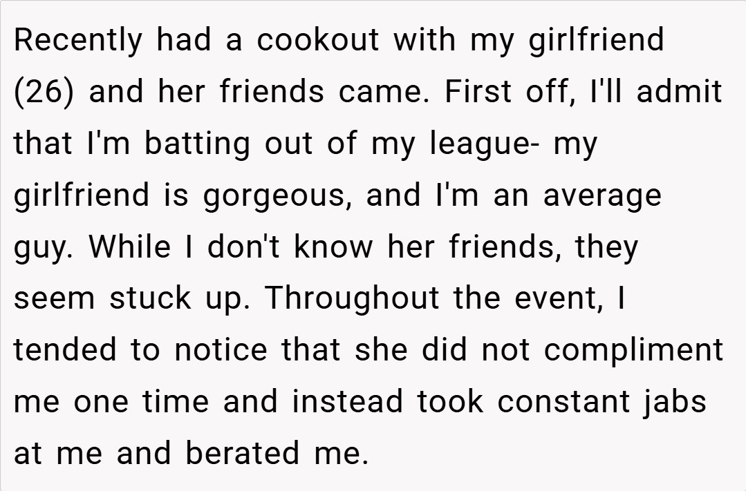 At social gatherings, we all expect a little light banter, but sometimes comments cross the line and sting in ways that linger long after the party is over. Recently, during a cookout with my girlfriend and some of her friends, I found myself on the receiving end of a barrage of hurtful jabs. Despite my insecurities—like my receding hairline and that questionable tattoo—I was hoping for a few kind words.