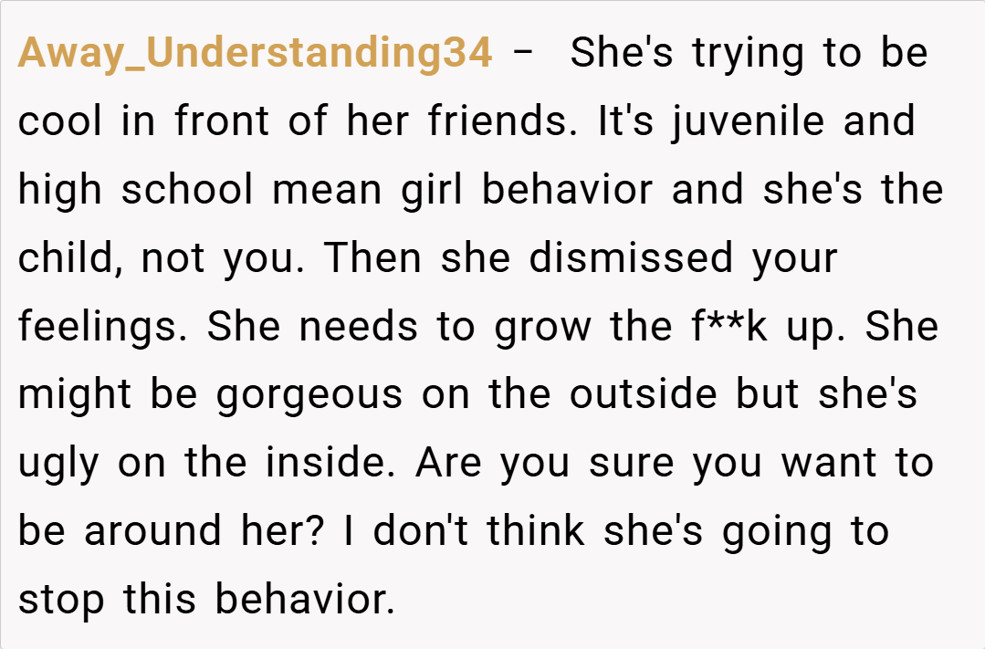 Instead, what unfolded left me questioning the respect in our relationship and my place in her life. When someone you love consistently undermines your confidence in front of others, it’s hard not to feel devalued and exposed.