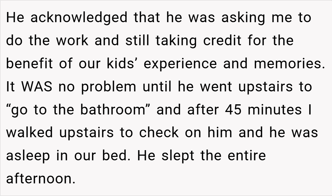 Recognizing and addressing this imbalance is key to maintaining a healthy relationship.” This perspective highlights that your frustration was not just about one missed task but a recurring pattern where your contributions go unnoticed, while credit is taken for creating positive family moments.