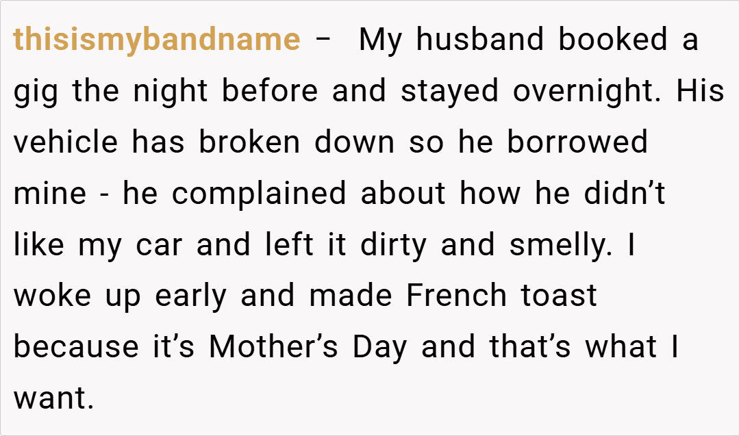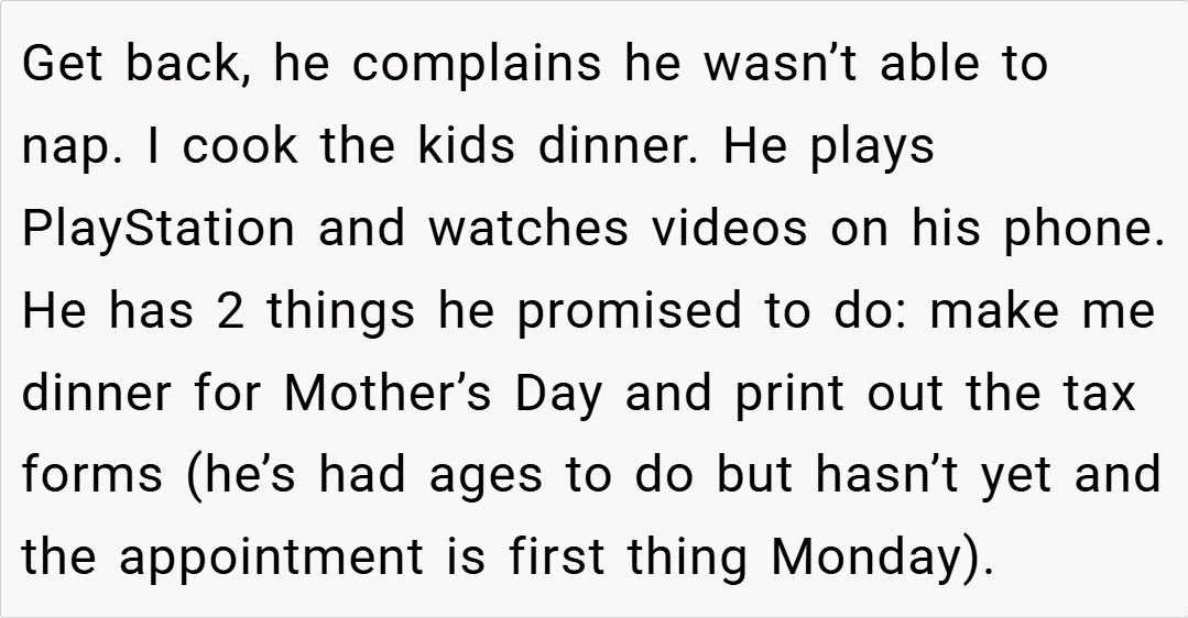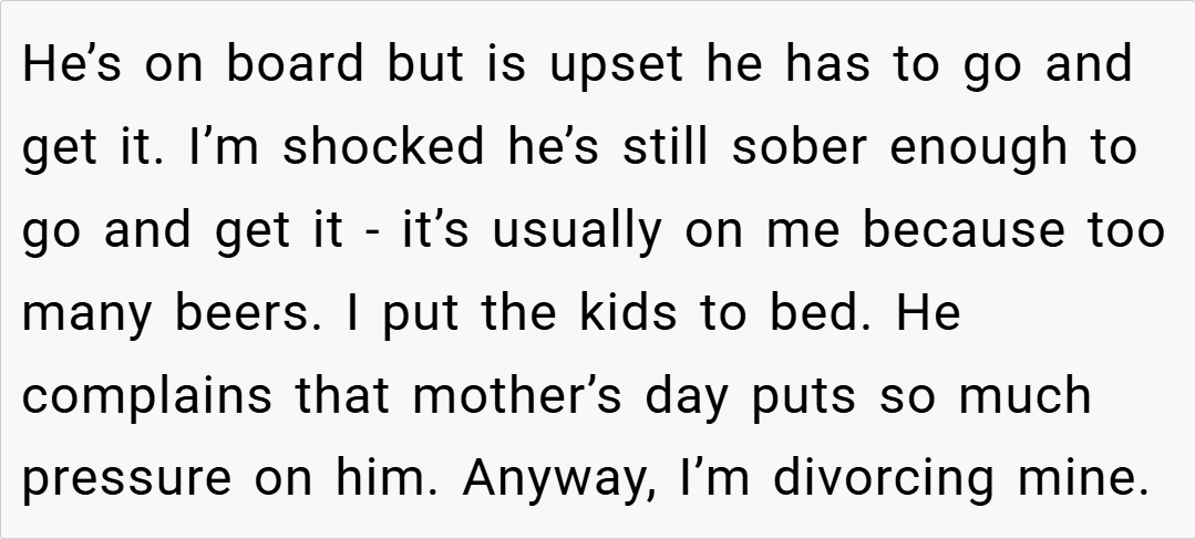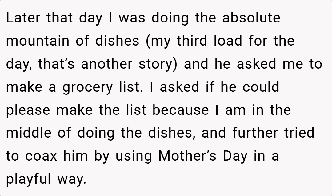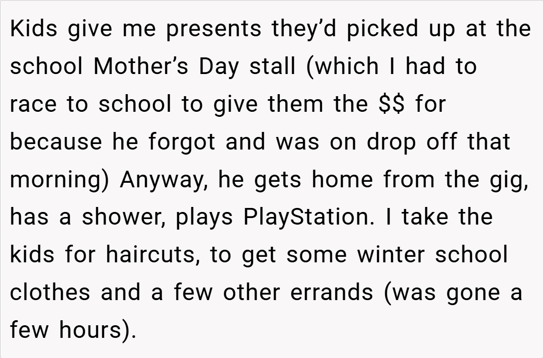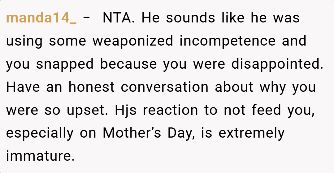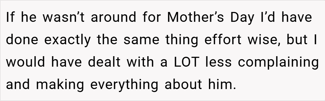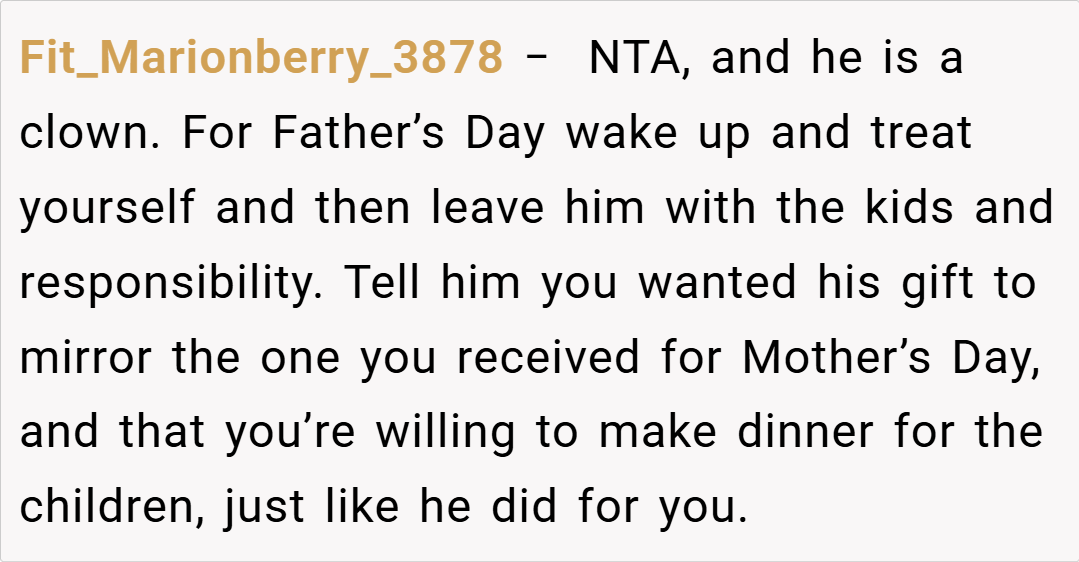 Ultimately, your “Happy Father’s Day” remark was an honest, if bittersweet, expression of feeling isolated in the shared responsibilities of your household. Your reaction is a call for change—a plea for a more balanced partnership where both parties actively contribute to daily tasks and support each other without the need for constant reminders.