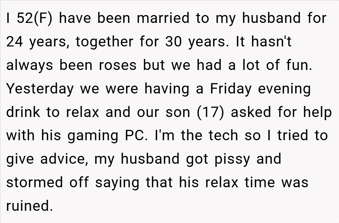 During a casual Friday evening drink, the conversation took an unexpected turn when their 17-year-old son asked for technical help with his gaming PC—a simple, everyday request from a mom who is used to being the family tech support. Her husband, however, became agitated and stormed off, claiming that his “relax time” had been ruined.