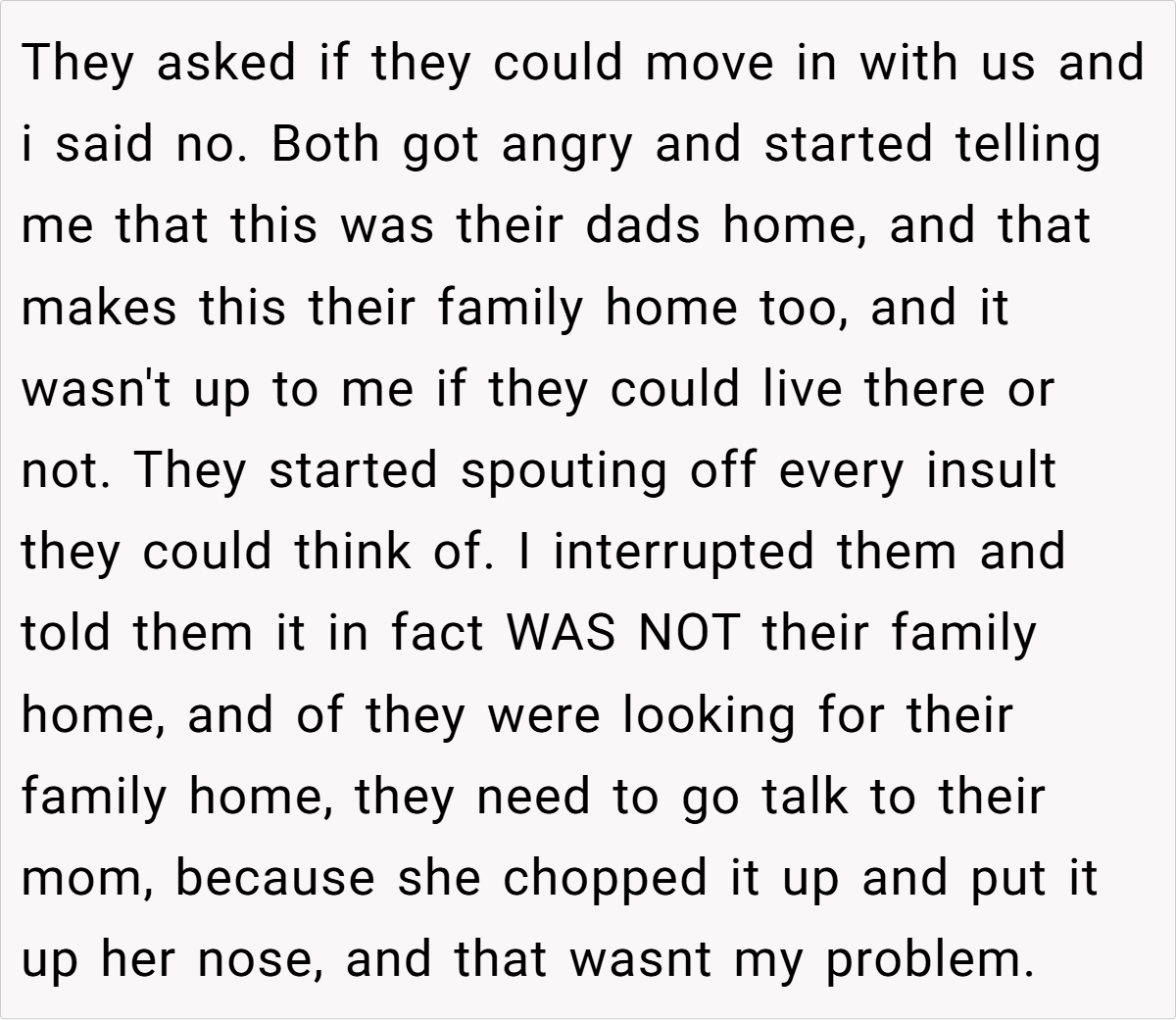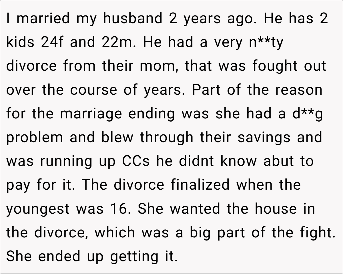 ‘AITAH for telling my husbands kids (24f 22m) that my house isn’t “their family home”, and its not my fault their mom lost theirs?’