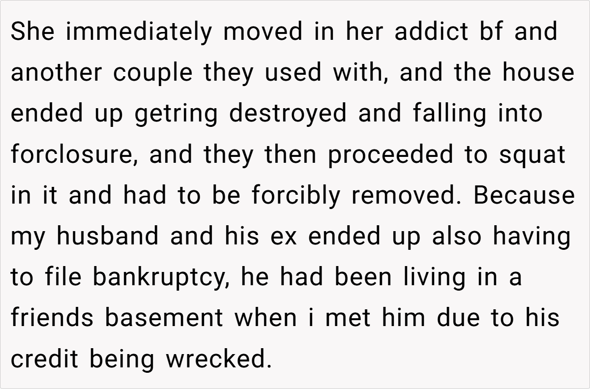 Furthermore, the fallout from a messy divorce can leave lasting imprints on everyone involved, especially when financial and emotional ruins are still fresh. The ex-wife’s history of unstable living arrangements—squatting and jeopardizing homes—casts a long shadow over any request to share a stable, carefully built sanctuary.