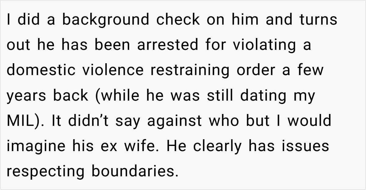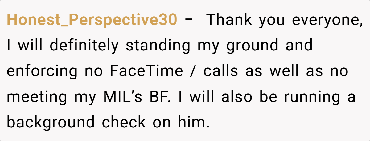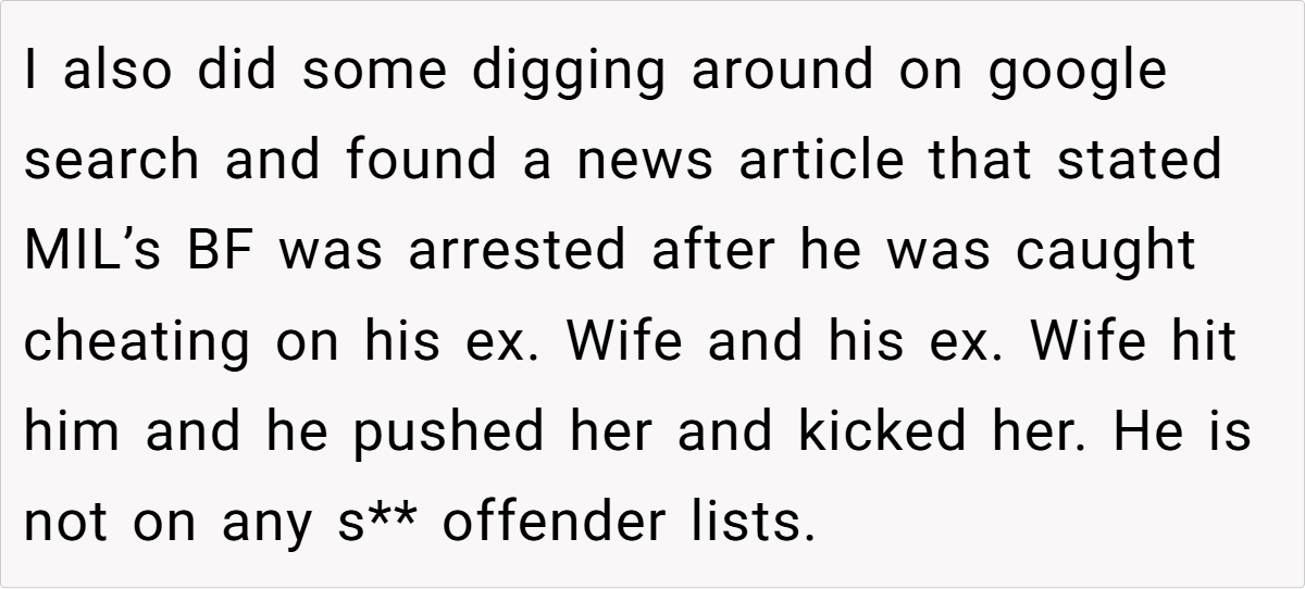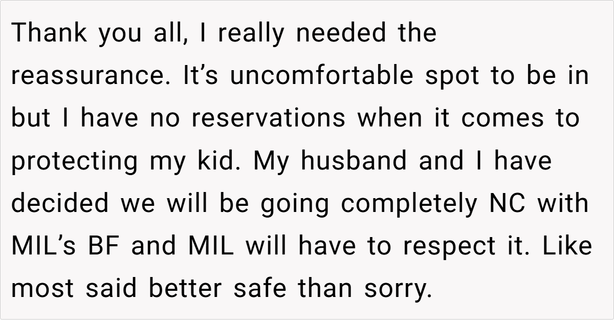 Another expert, family therapist Dr. Melissa Hart, notes, “A parent’s instinct to protect is rarely misplaced. When you observe behaviors that seem overly invasive or grooming in nature, it is vital to set firm boundaries.” In this case, the decision to go no-contact with the MIL’s boyfriend reflects a commitment to safeguard the toddler’s wellbeing. The background check revealing his previous arrests further reinforces that these boundaries are essential rather than an overreaction.