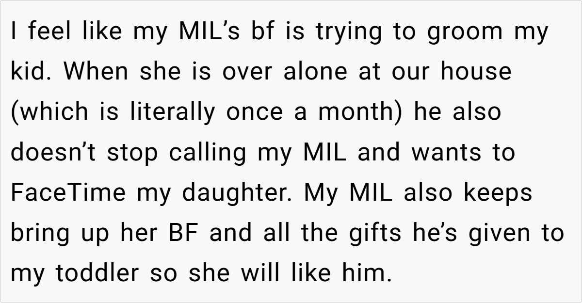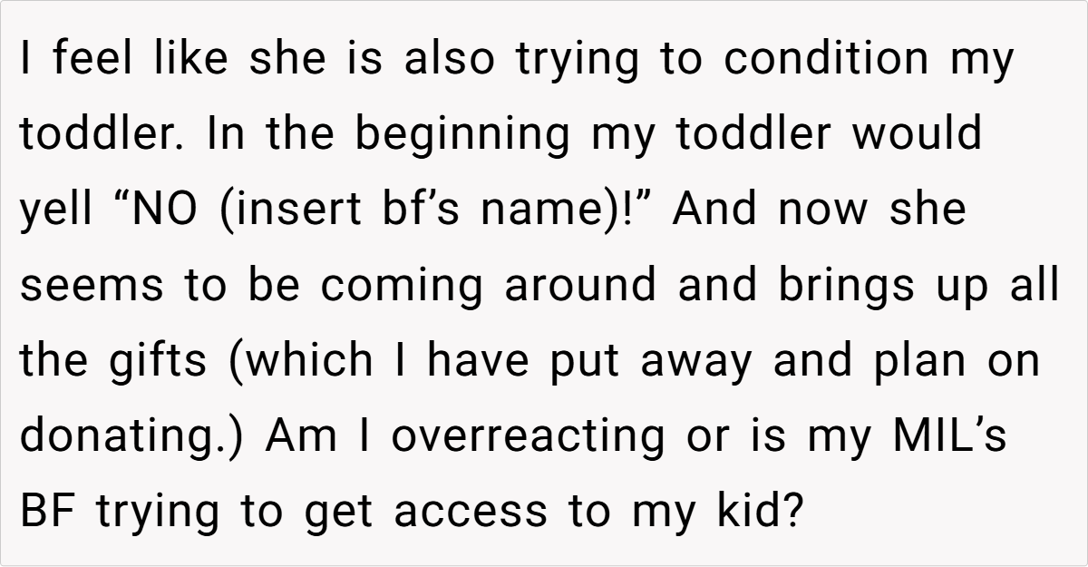 ‘AITAH For telling my MIL(59) to keep her BF(62) away from my toddler (2). Am I overreacting?’