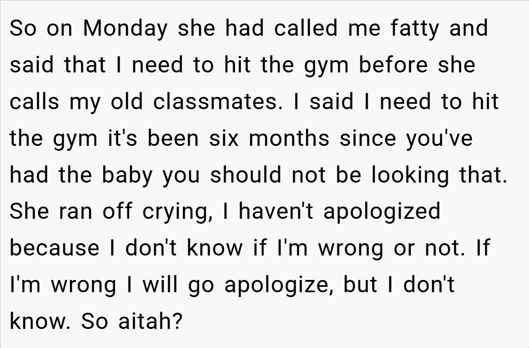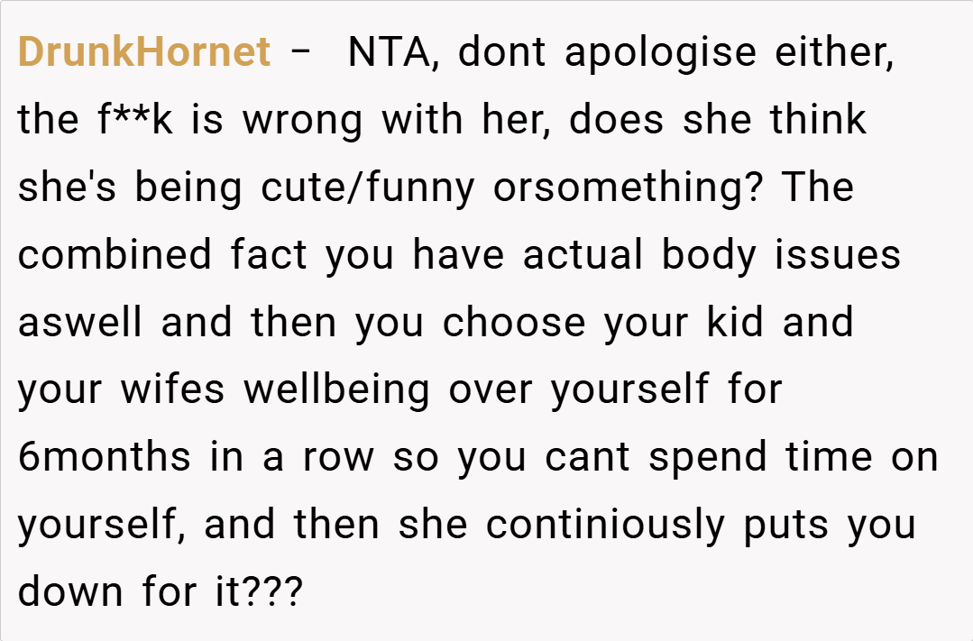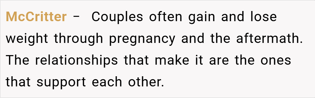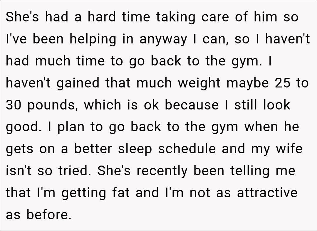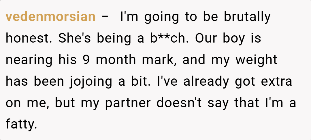 When tensions run high in a relationship, especially during the vulnerable postpartum period, hurtful words can trigger old insecurities and create a vicious cycle. In this case, the husband’s decision to echo his wife’s comments about his weight not only reflects the pain of past bullying but also highlights the stress that new parenthood can bring.