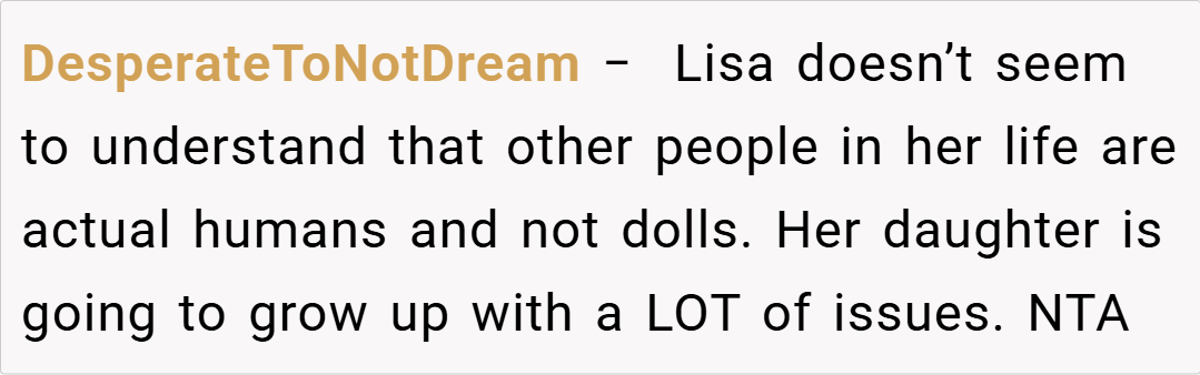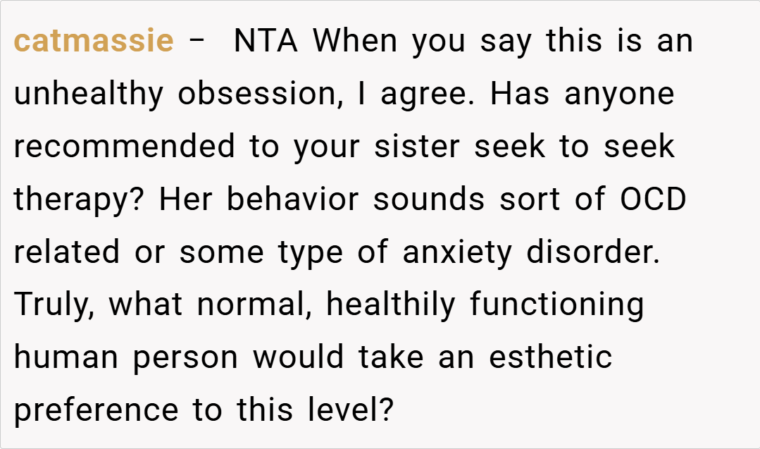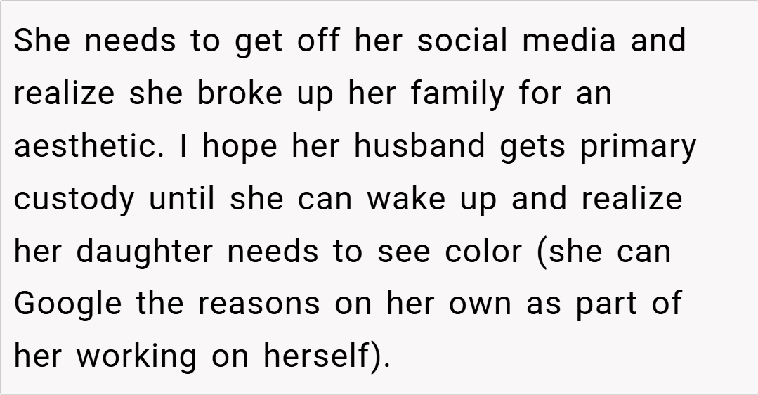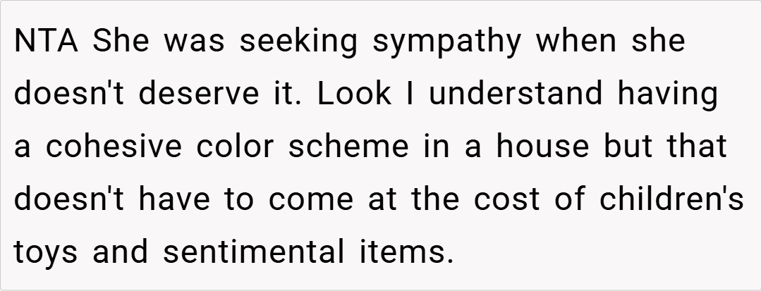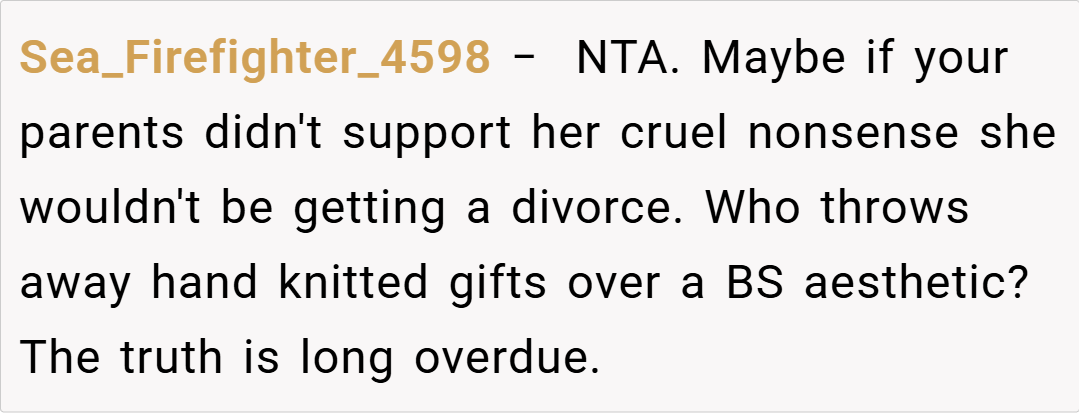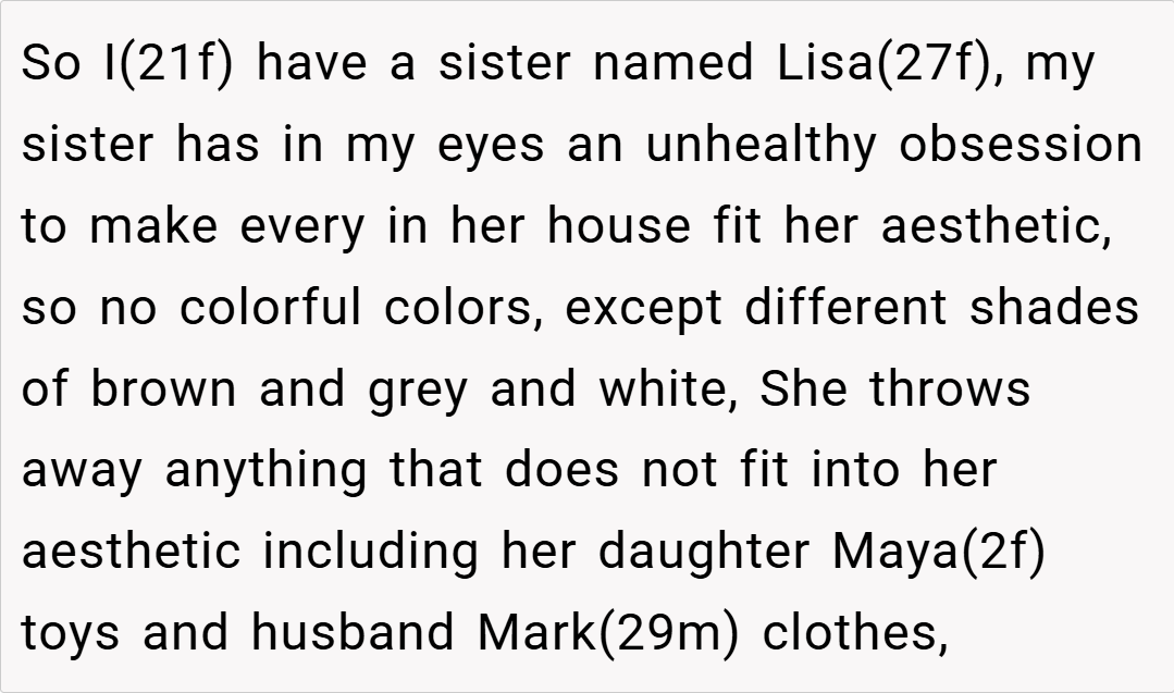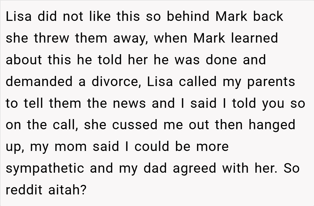 Over the years, Lisa’s obsession with a strict palette has led her to discard anything that doesn’t match her vision, including cherished items and even sentimental gifts. The inevitable fallout has now reached a dramatic crescendo: Mark has filed for divorce, and our narrator couldn’t help but add a painful “I told you so” during the family call.