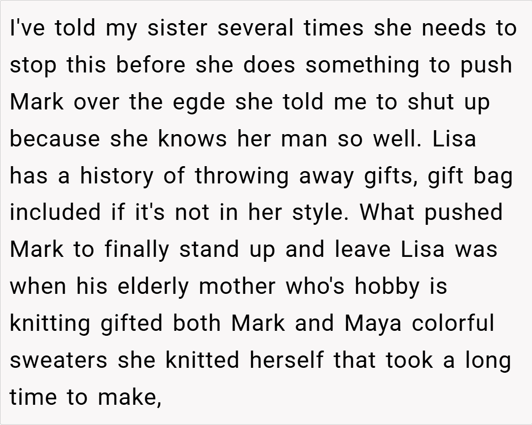When Lisa learned that a thoughtful, handmade gift from Mark’s mother had been destroyed solely because it wasn’t “on brand,” it marked the final straw. Her refusal to acknowledge the sentimental value of these items was a betrayal that reverberated through the family, leaving a wake of unresolved grief and anger. Furthermore, the interplay of personal responsibility and accountability in family relationships is vital.