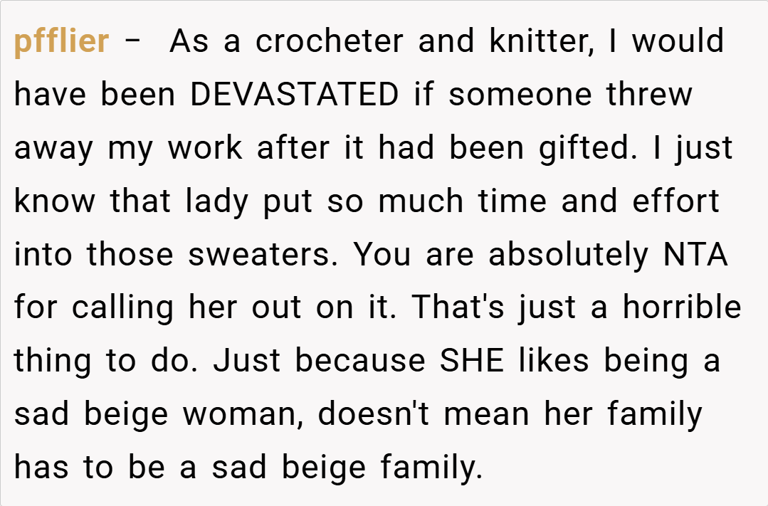 At its core, this story isn’t just about clashing tastes or discarded gifts—it’s a reflection of the deeper emotional scars that can result from neglecting the true value of family and sentiment. While our narrator’s “I told you so” may sting like the aftermath of a long-ignored warning, it also serves as a reminder that maintaining balance in personal relationships is crucial.