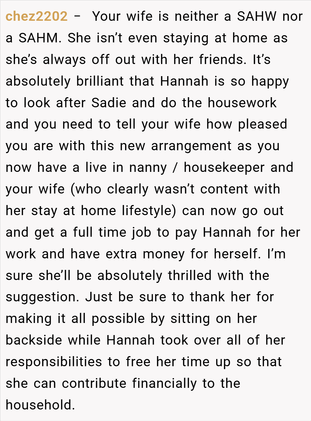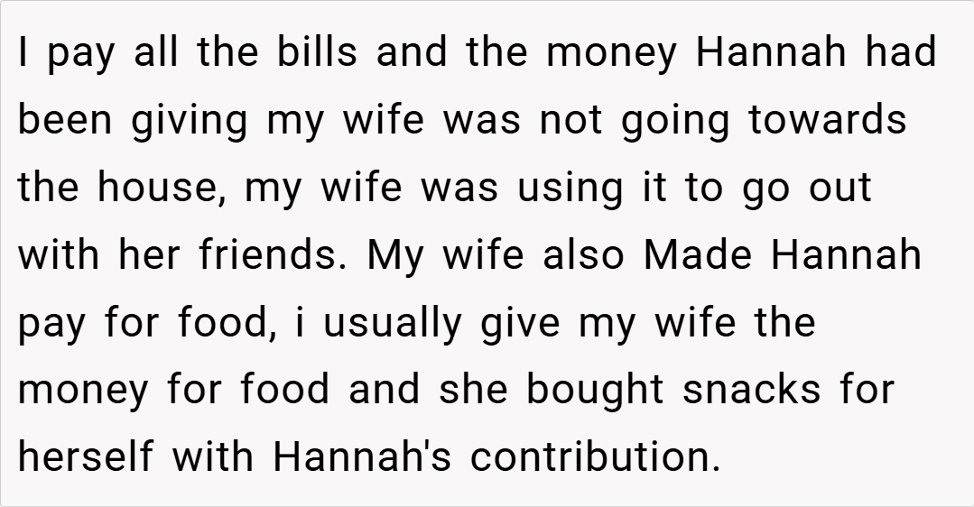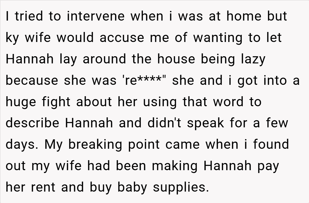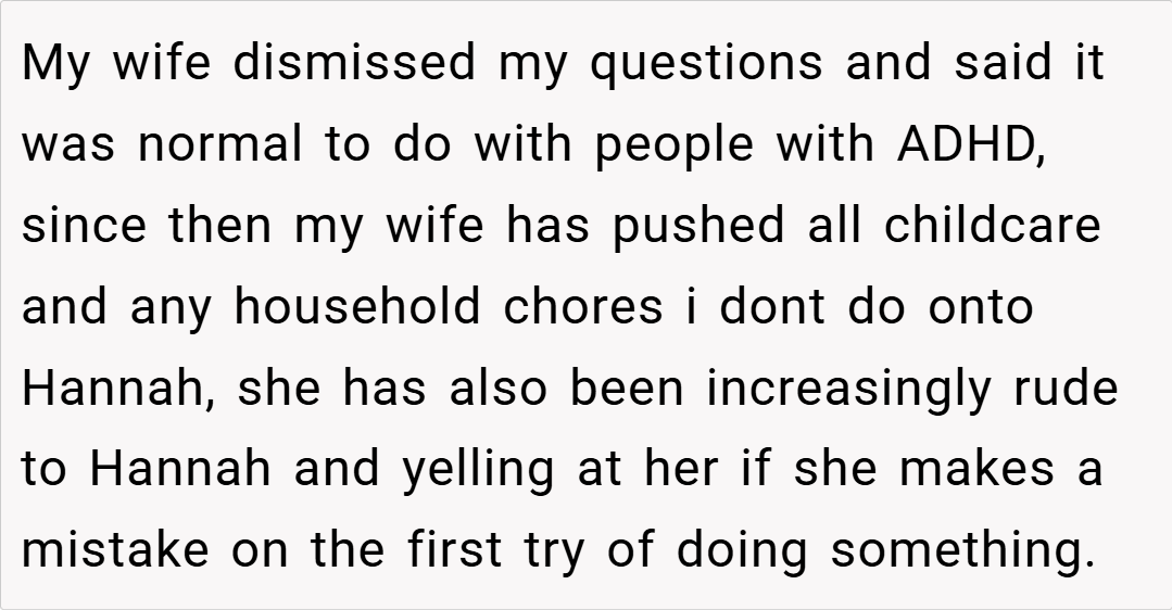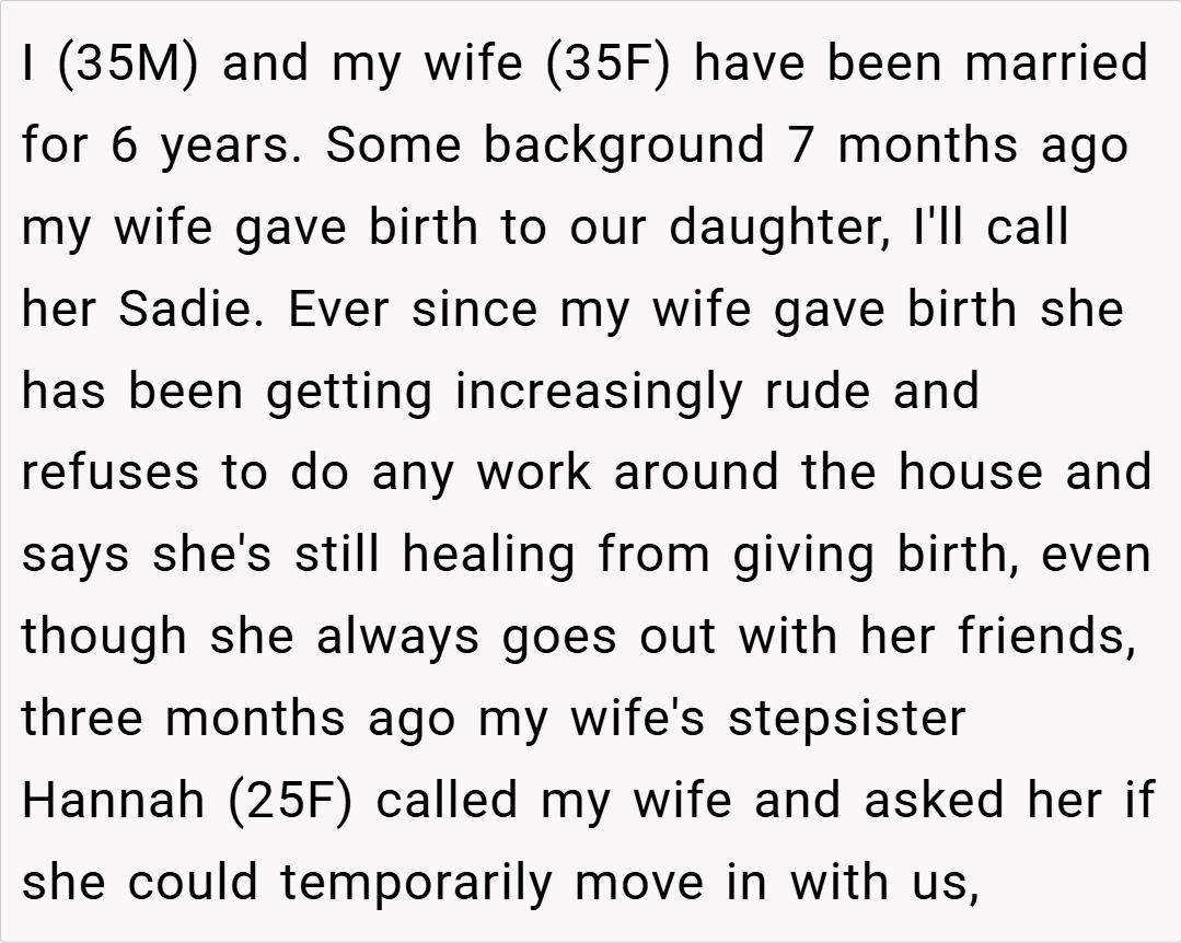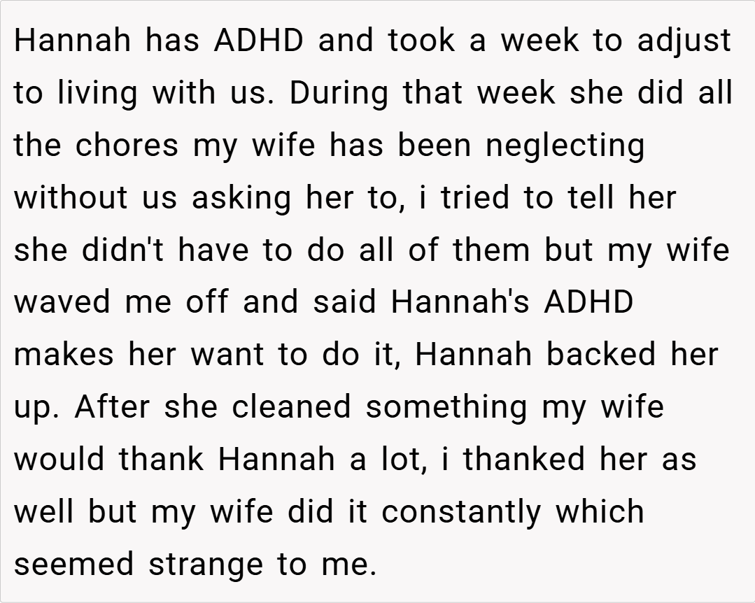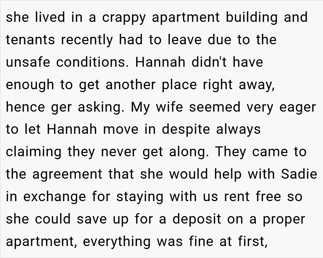 Matters took a turn when his wife eagerly allowed her stepsister, Hannah, to move in for a temporary period, despite a history of tension between them. What initially seemed like a chance for extra help quickly became a source of conflict as Hannah, who has ADHD, took on the chores his wife had long neglected. As the weeks passed, the situation worsened: his wife started offloading all childcare and household duties onto Hannah while even making her pay for rent, food, and baby supplies.