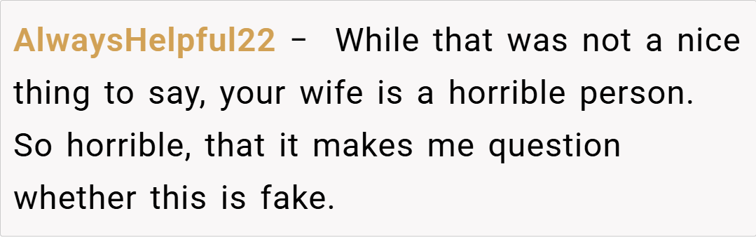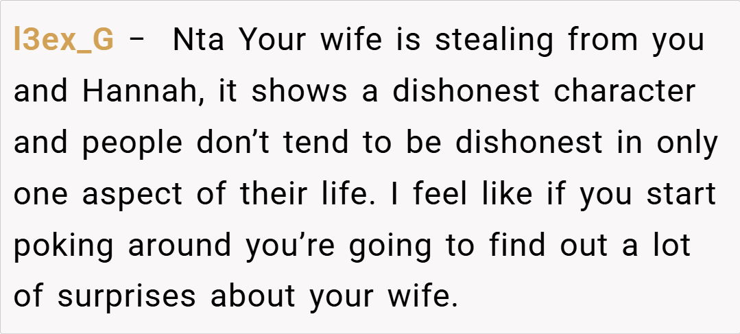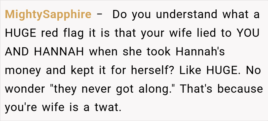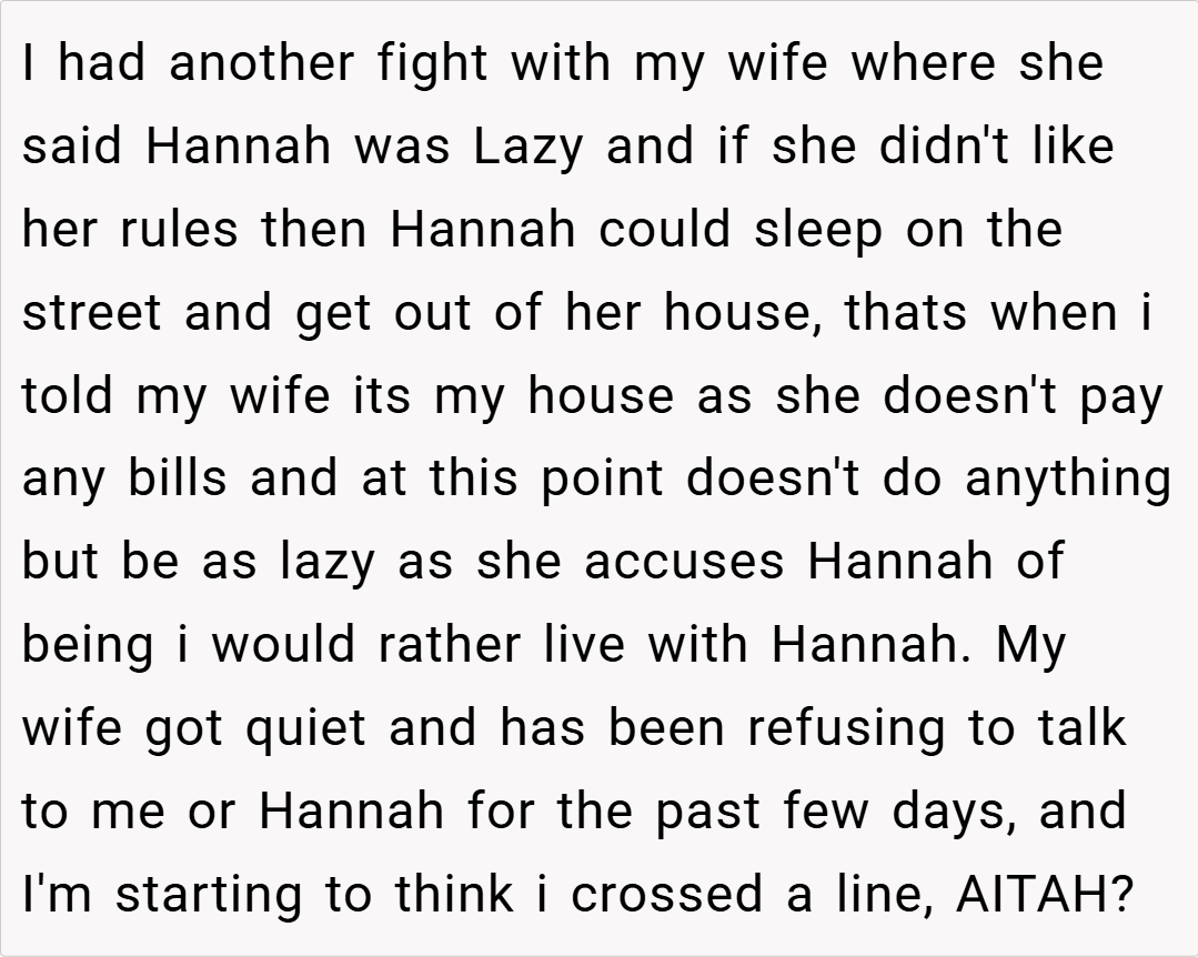 Fed up with the unfair dynamics and feeling that his wife’s actions were hypocritical, the OP reached a breaking point. In a heated confrontation, he declared he would rather live with Hannah than continue with his wife as she is—he argues—being lazy and unappreciative of his efforts. Now, his wife has become silent, and family members are taking sides. The OP now wonders if he’s in the wrong for drawing such a hard line.