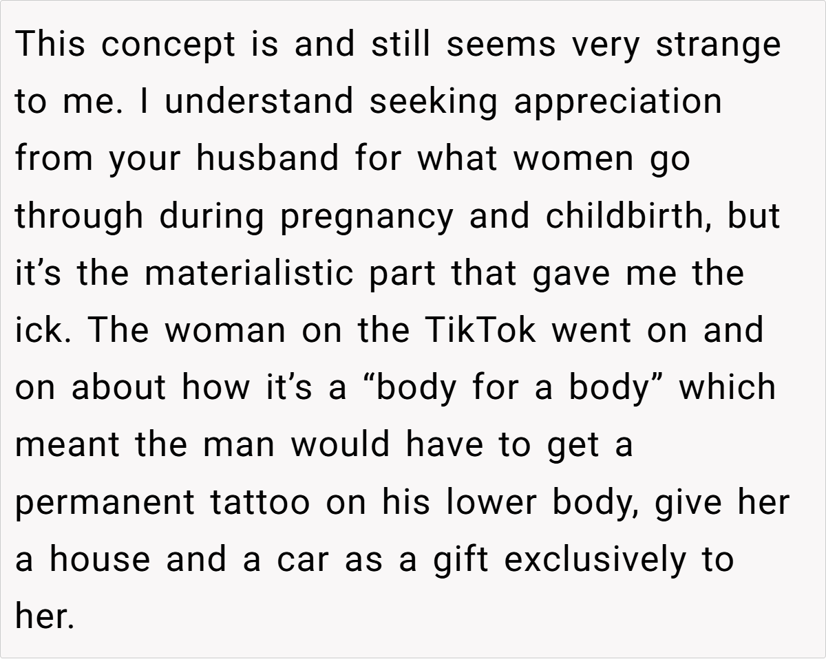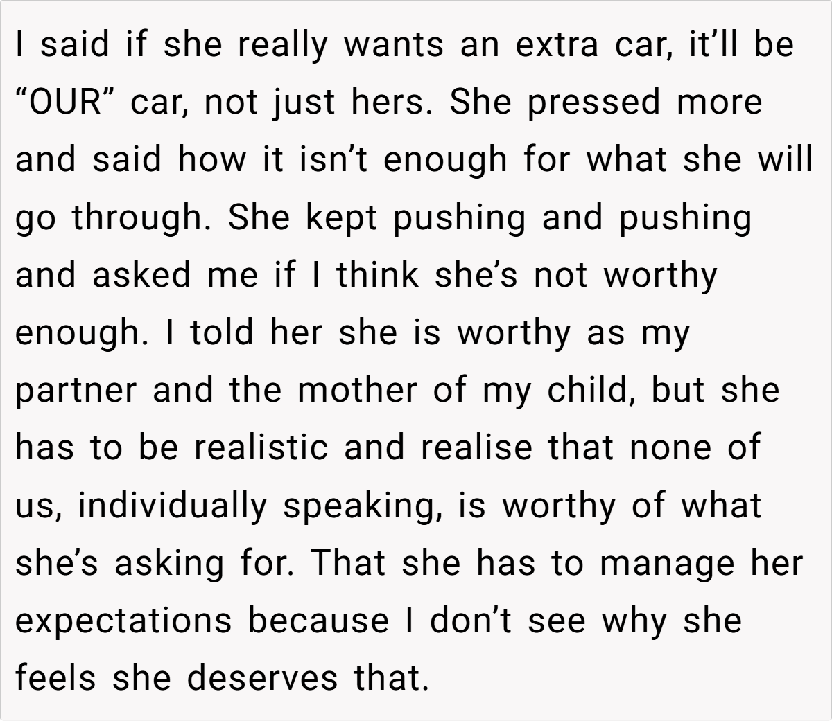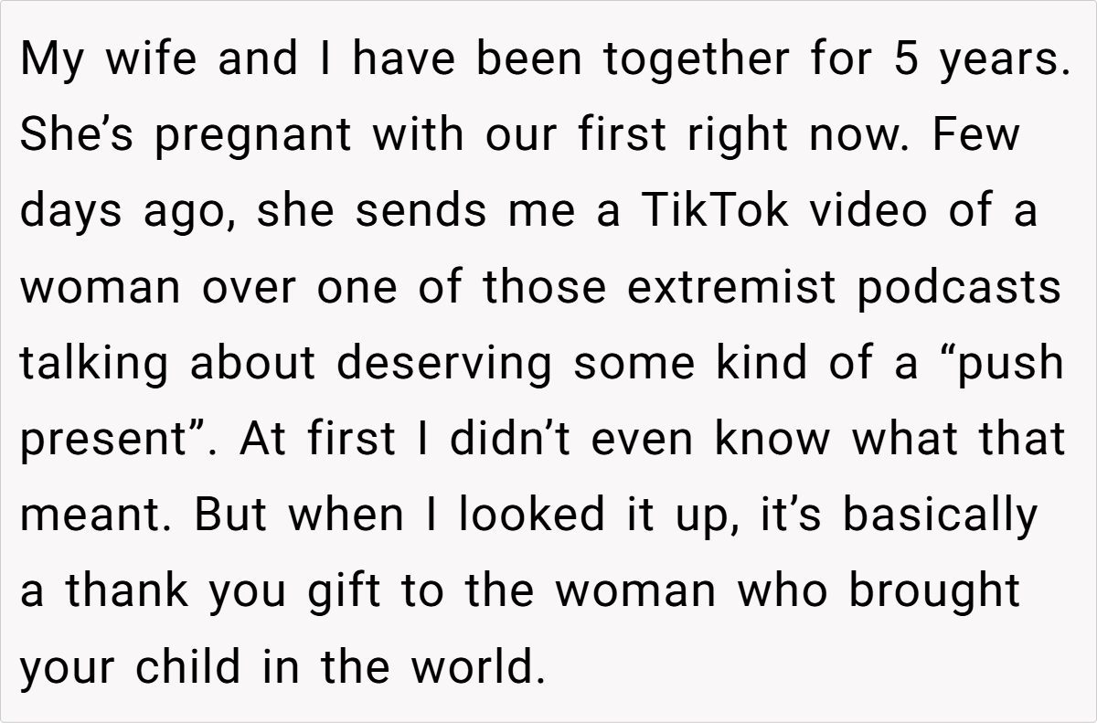 This dilemma became personal for one man when his pregnant wife requested a luxury car as her push present, citing a viral TikTok video. He was taken aback by her expectations, leading to a heated debate about financial boundaries, appreciation, and social media’s influence. Was he wrong for rejecting the idea, or was his wife being unreasonable? Read on for the full story and the perspectives surrounding it.