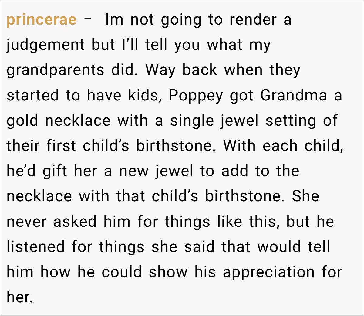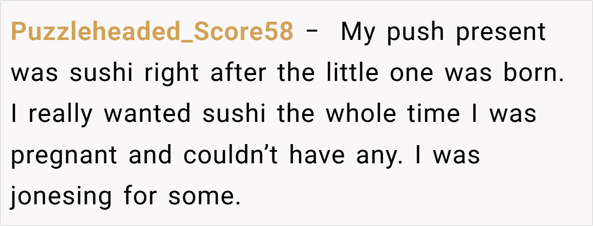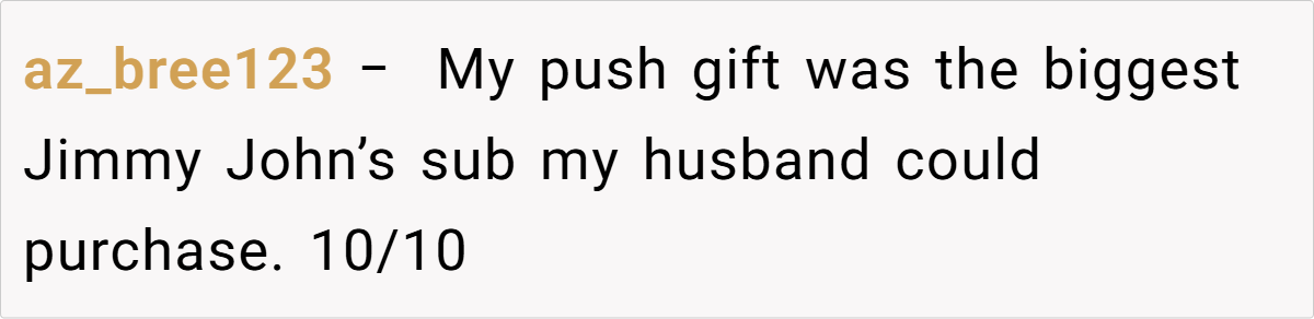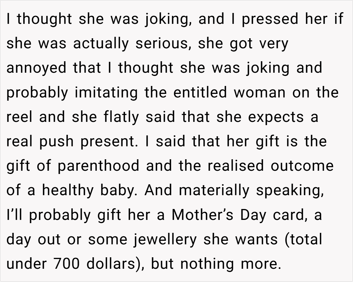 Reddit users had strong reactions to the original poster’s dilemma. Many agreed that push presents should be meaningful but reasonable: