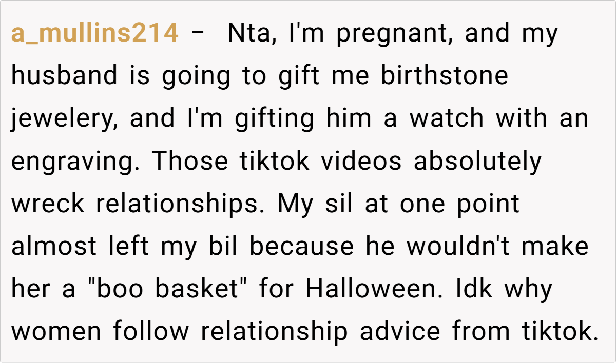 Some users shared sentimental gift ideas, such as birthstone jewelry or a heartfelt gesture, while others criticized social media for promoting entitled attitudes. One commenter noted, “Influencers are ruining relationships with unrealistic expectations.” However, some argued that the husband’s reaction may have been too dismissive, suggesting that communication could have been handled more sensitively.