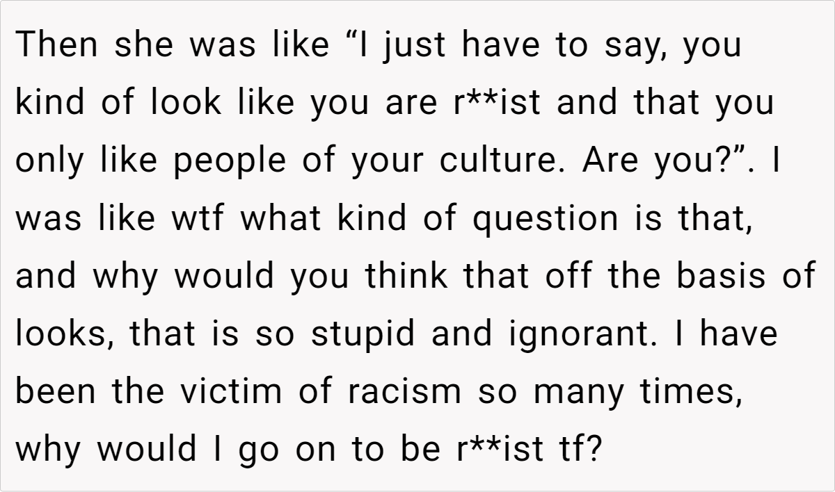 In this instance, the OP was confronted with a sweeping and baseless generalization that not only mischaracterized his identity but also dismissed his lived experiences with racism. His reaction, though forceful, was a stand against the perpetuation of harmful assumptions.
