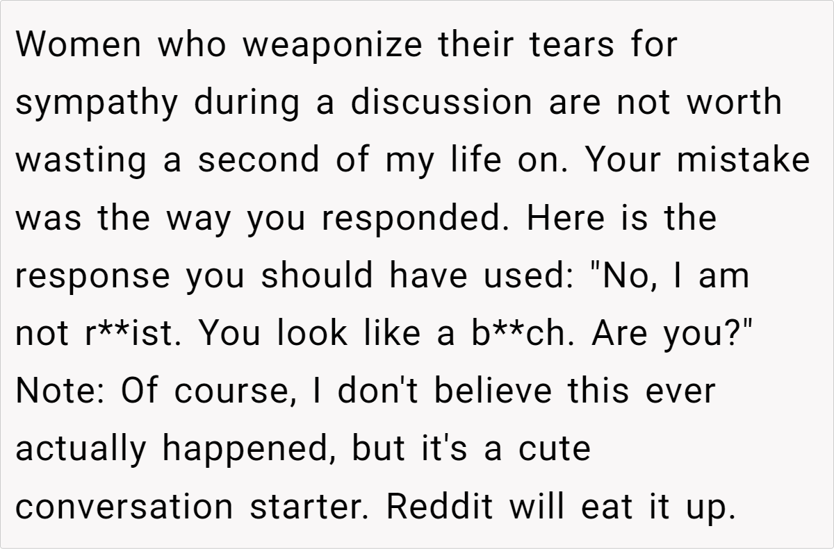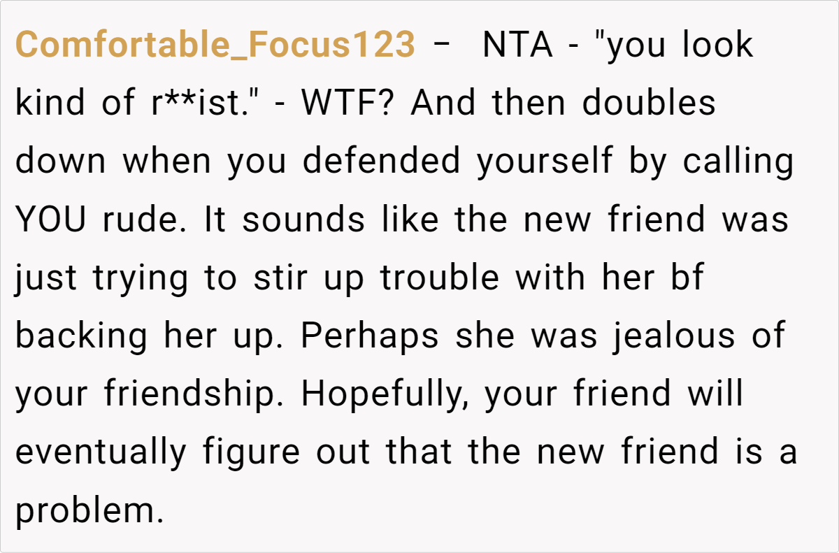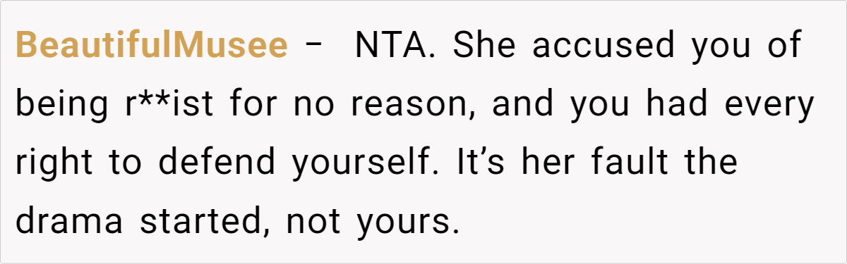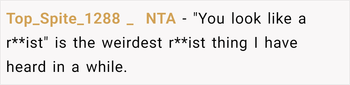 The community overwhelmingly backs the OP’s decision, with many expressing relief that someone finally called out the baseless accusation. Commenters note that labeling someone a “r**ist” based solely on appearance is not only ludicrous but also a lazy attempt to provoke conflict.
