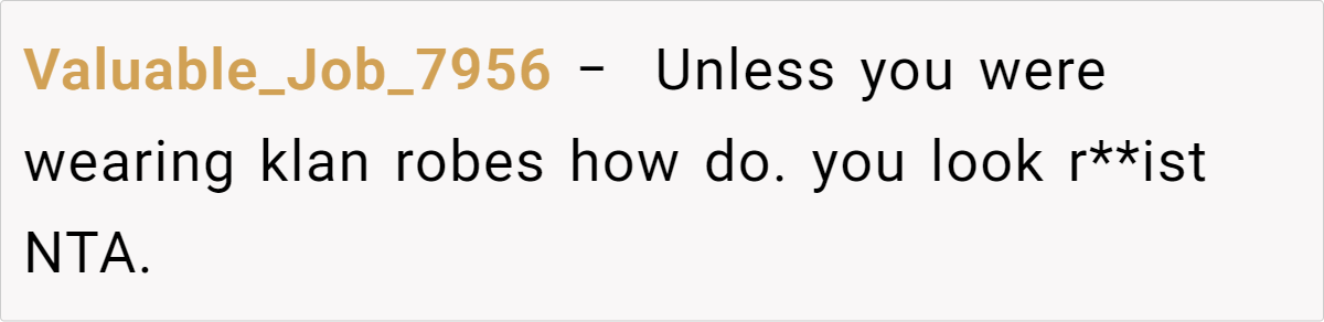 Addressing issues of racial insensitivity in social settings requires a balance of assertiveness and clarity. The OP’s response, though blunt, stemmed from a history of personal pain and repeated encounters with discrimination. Experts note that when an individual is repeatedly forced to defend their identity, it can become emotionally exhausting.