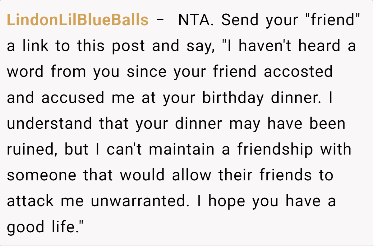 In the end, the incident at the birthday dinner isn’t just about hurt feelings—it’s about challenging outdated stereotypes and demanding respectful interaction. While the OP regrets that the evening didn’t go smoothly, he also stands by his right to defend his identity against unfounded accusations.