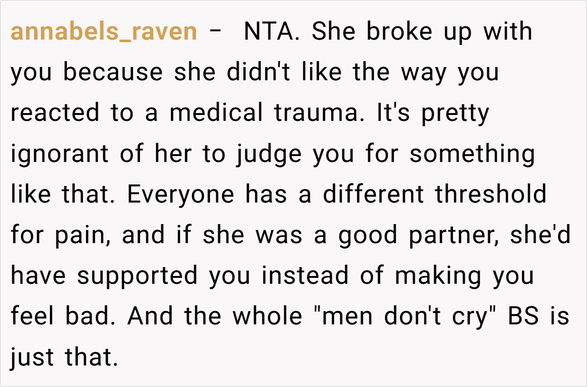 In this case, our poster’s painful accident and subsequent emotional outburst quickly became the reason for a breakup that left everyone reeling. His story is not only a personal tragedy—it’s a snapshot of the pressures imposed by outdated ideals of what it means to be “manly.” At its core, this situation is a clash between genuine human vulnerability and rigid, often unrealistic, societal expectations. The poster experienced a severe accident that left him both physically and emotionally raw. Yet, instead of receiving empathy, his partner chose to view his tears as a weakness.