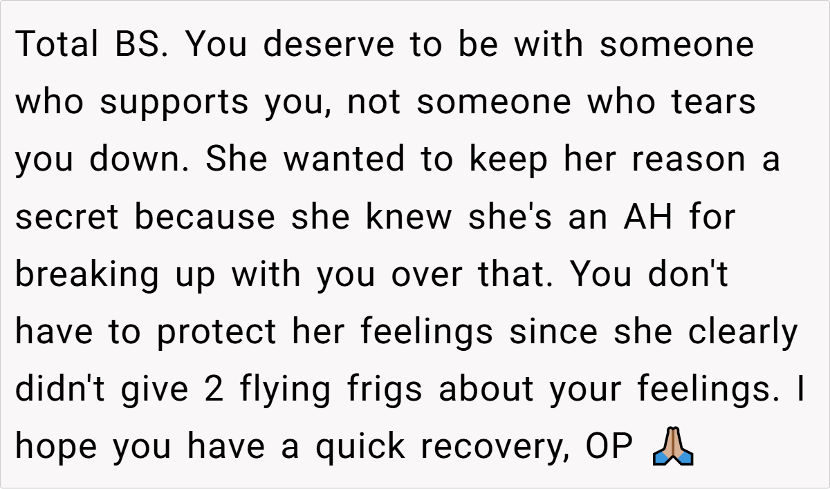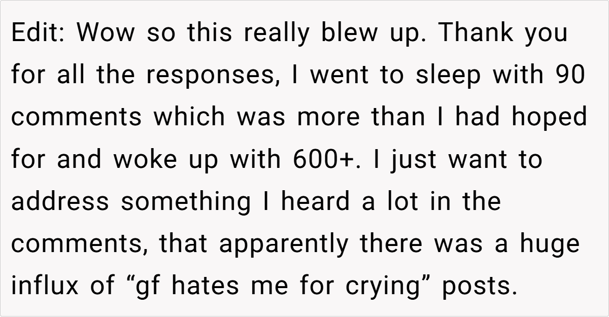 In wrapping up, it’s clear that this story isn’t simply about a breakup—it’s a call to reexamine the way we perceive vulnerability and strength. Whether you agree with the poster or see things differently, his experience sparks an important conversation about empathy, authenticity, and the evolving nature of modern relationships. What would you do if you found yourself in a similar situation? Share your thoughts, experiences, and let’s keep the dialogue open.