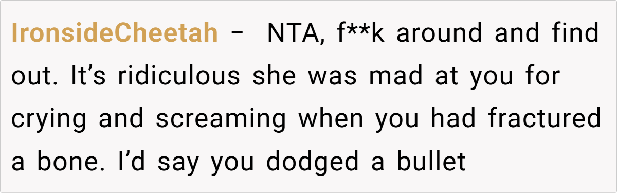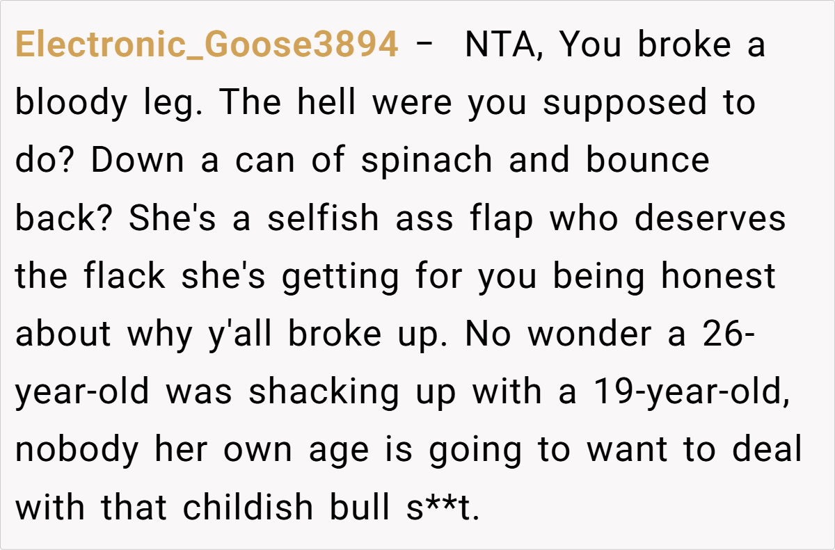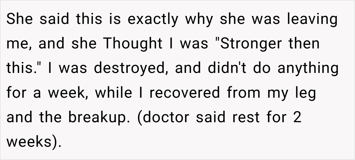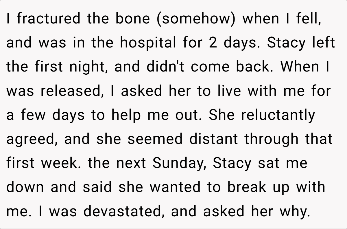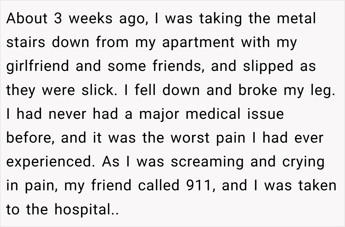 It all began on what seemed like a routine day at college—a day destined for unexpected twists. One fateful moment on slick metal stairs turned into a painful ordeal, as our poster’s raw, unfiltered reaction to a broken leg set off a chain of events he never imagined. In the midst of excruciating pain, his very human display of emotion sparked a breakup that resonated far beyond his personal heartache.