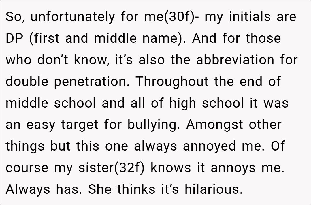 Names can be more than just labels—they carry personal stories and sometimes painful memories. Our OP, a 30‑year‑old woman, has endured years of bullying due to her initials, “DP,” which, unfortunately, are also an abbreviation for a very explicit term. Over the years, this has been a constant source of irritation and humiliation, especially when her own sister—who clearly finds humor in the situation—teases her by calling her “Aunt DP.”