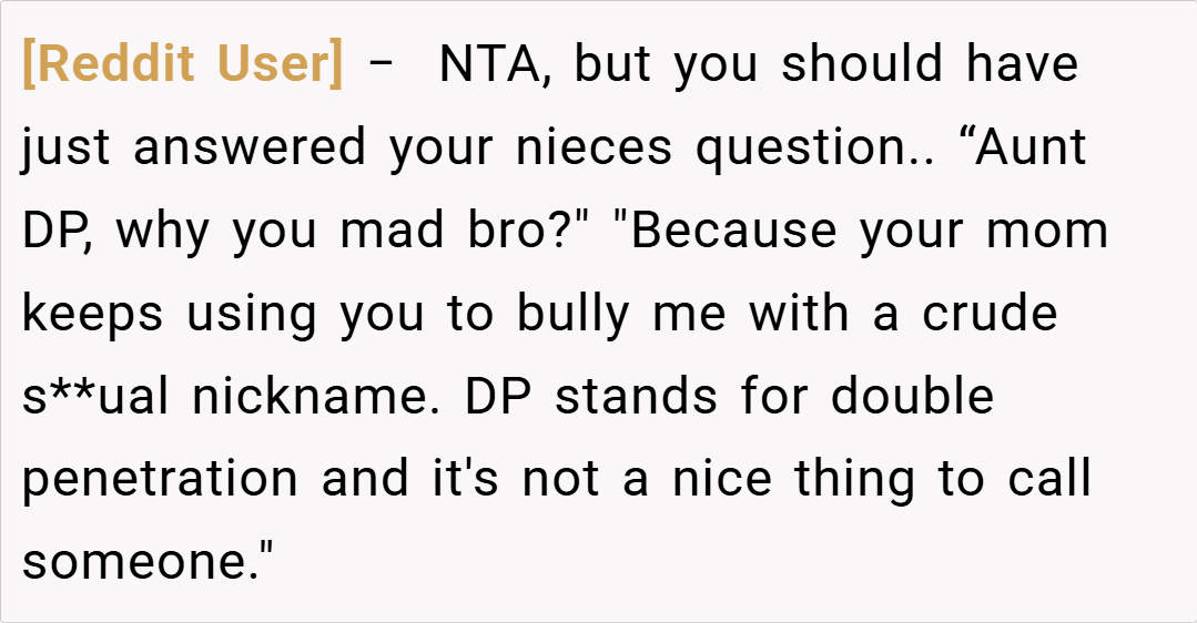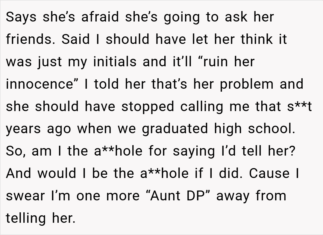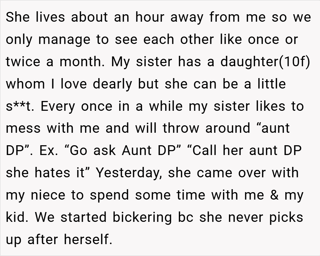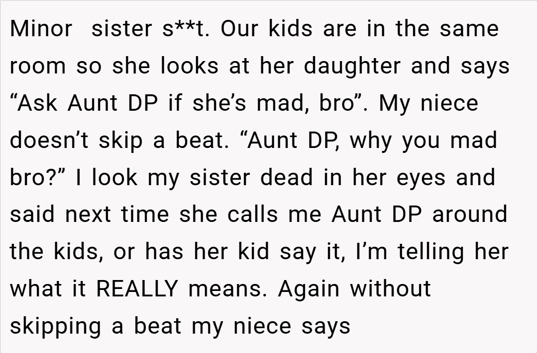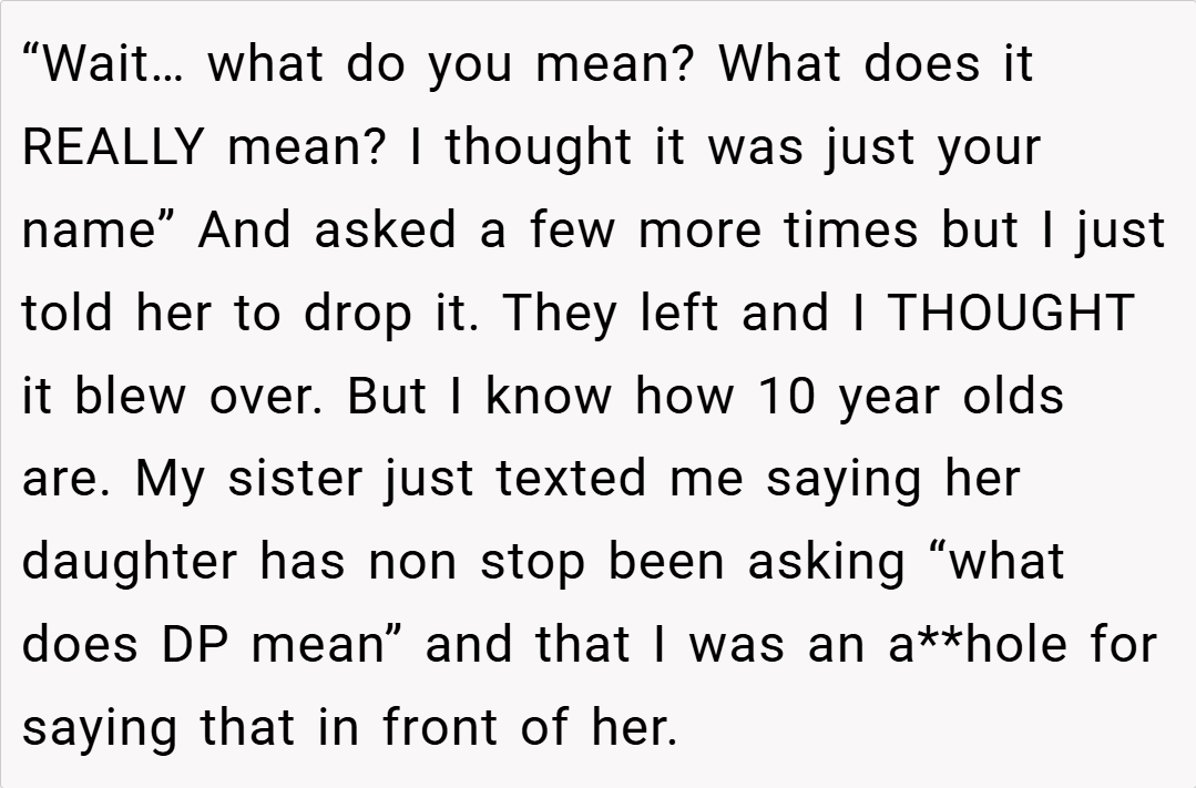 During a recent visit, when her sister used this nickname in front of her 10‑year‑old niece, our OP reached her breaking point. In a moment of heated frustration, she threatened that if her sister ever called her “Aunt DP” around the kids again, she would explain the true meaning of “DP” to her niece. Now, with her sister upset over the prospect of “ruining her niece’s innocence,” the OP wonders: Am I the asshole for threatening to reveal what “DP” really means?