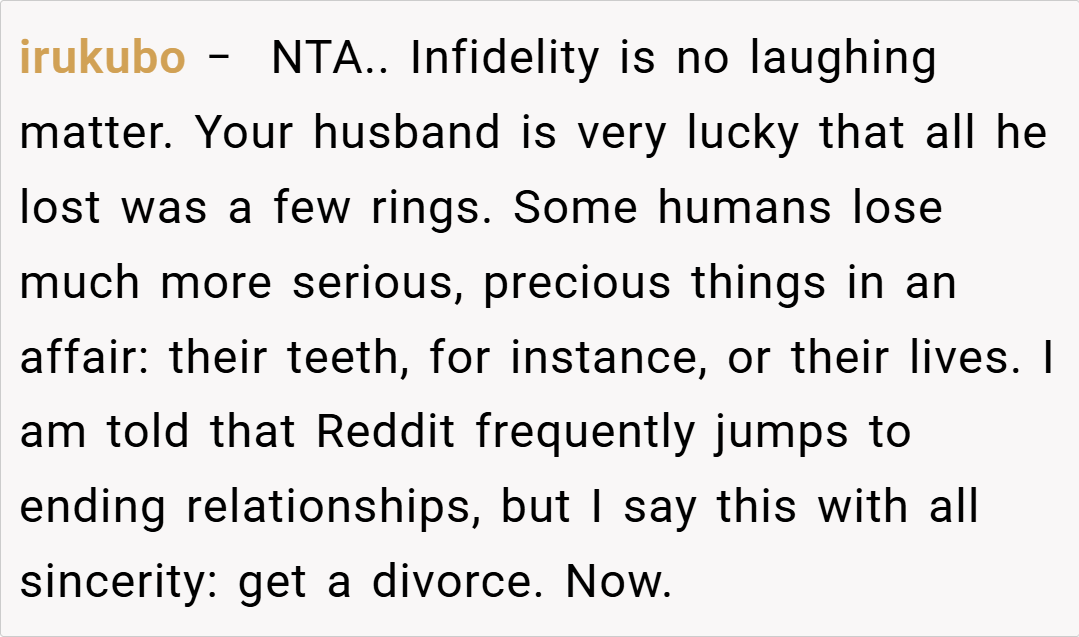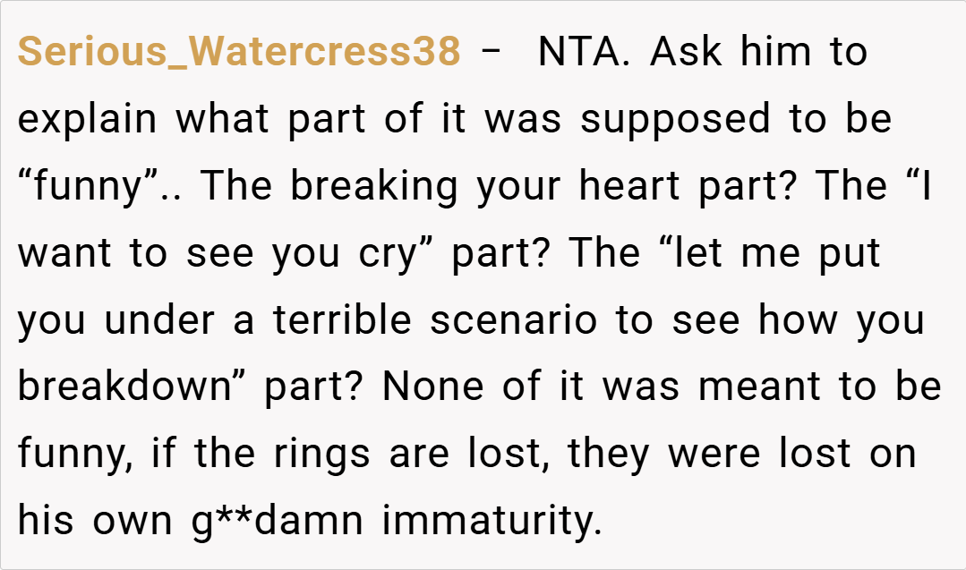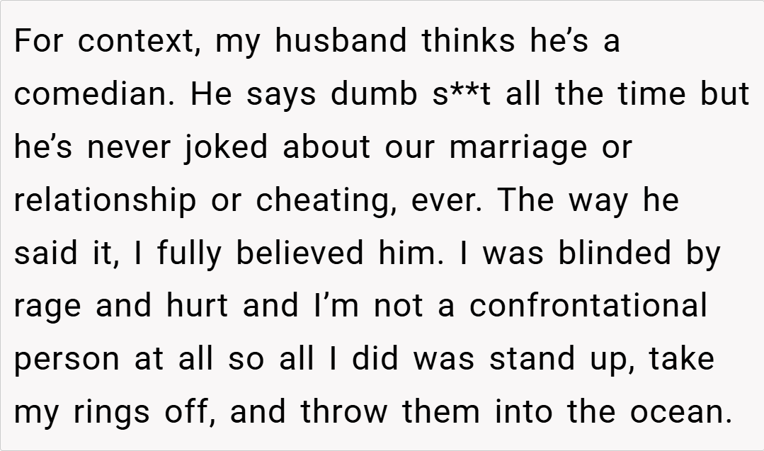 ‘AITAH for throwing my rings in the ocean after my husband told me he had an affair, even though it was a “prank” ?’