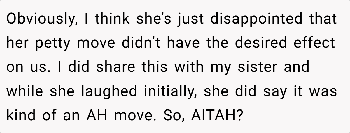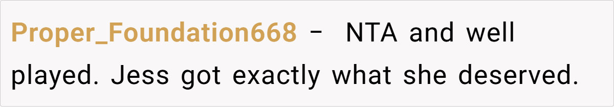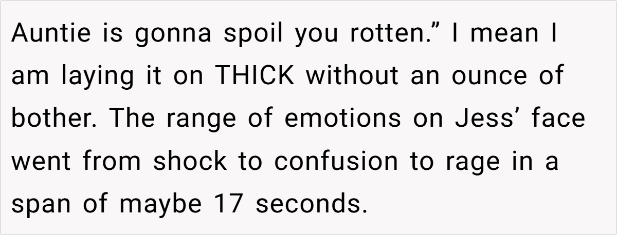 The OP’s measured reaction—delivering an over-the-top compliment in response to Jess’s misstep—served as both a defense mechanism and a way to reclaim control over the narrative. While it may have stung Jess’s pride, it also highlighted the importance of self-assurance in the face of provocations. Ultimately, this experience serves as a reminder that even in the most personal of family matters, clarity, and assertiveness are indispensable.
