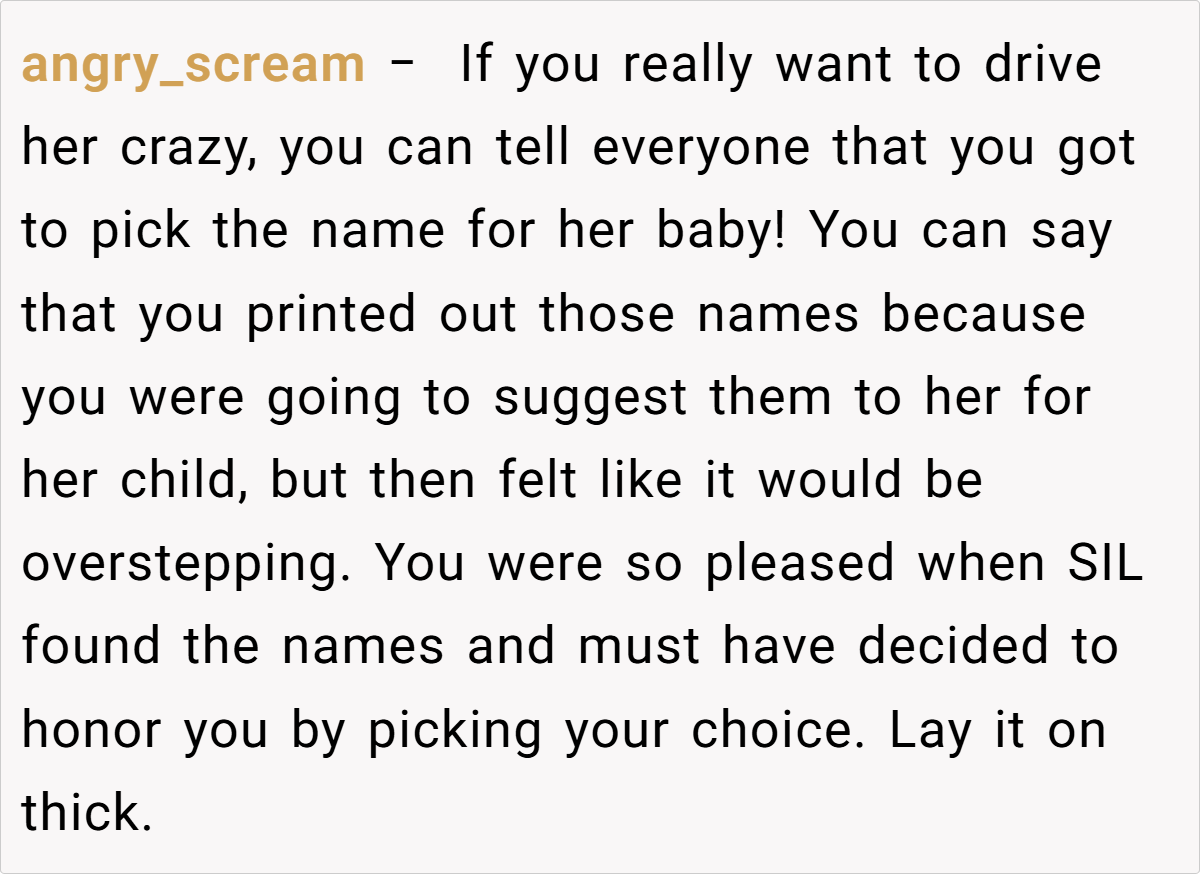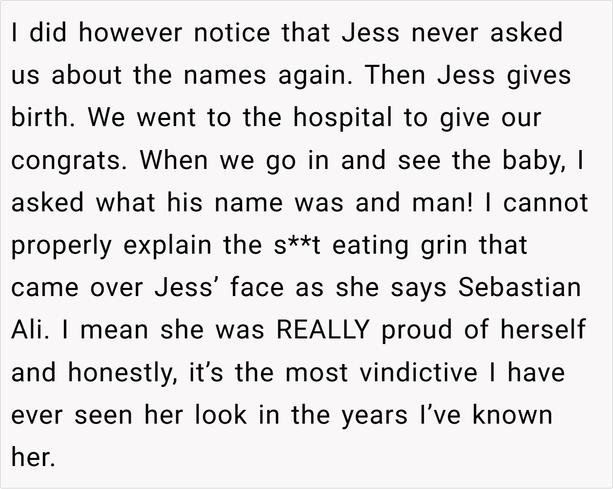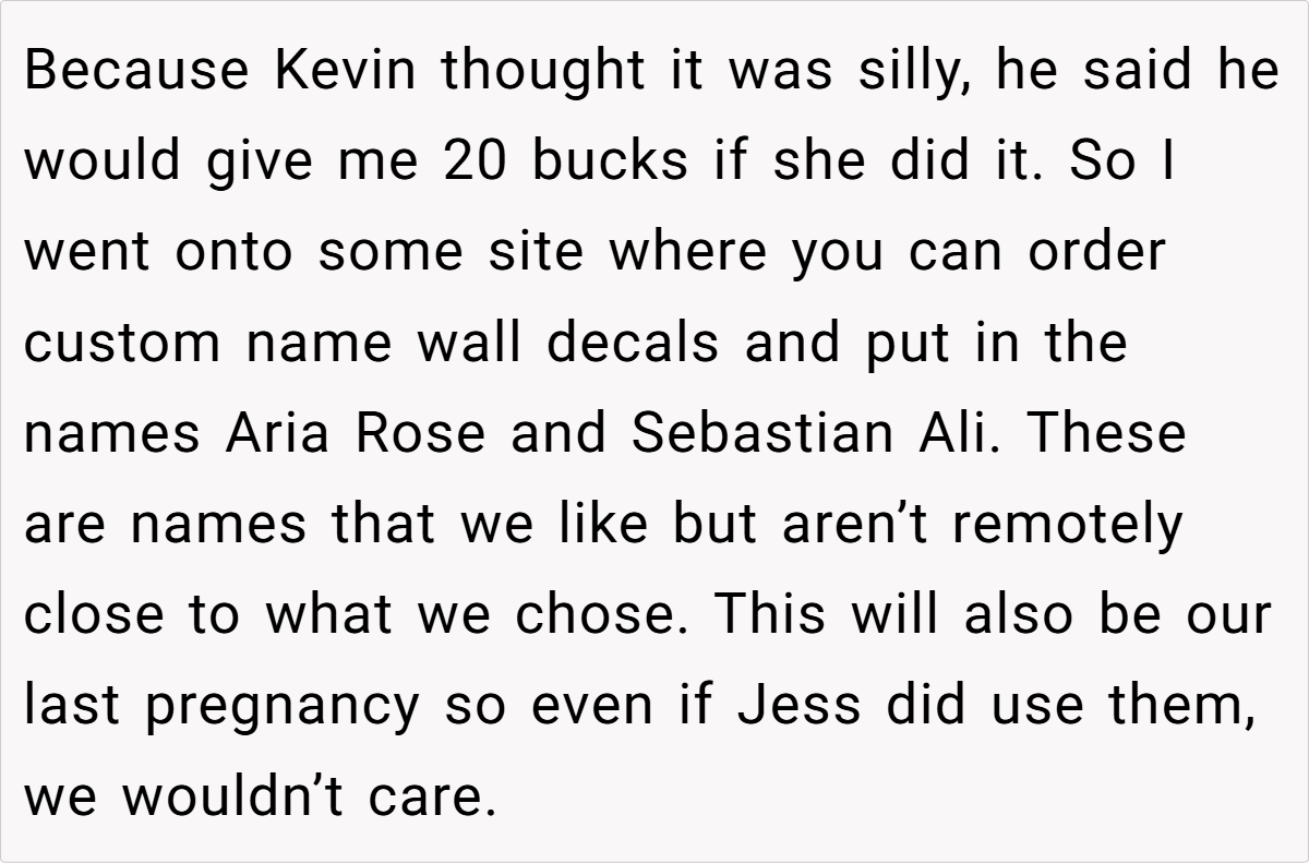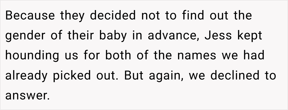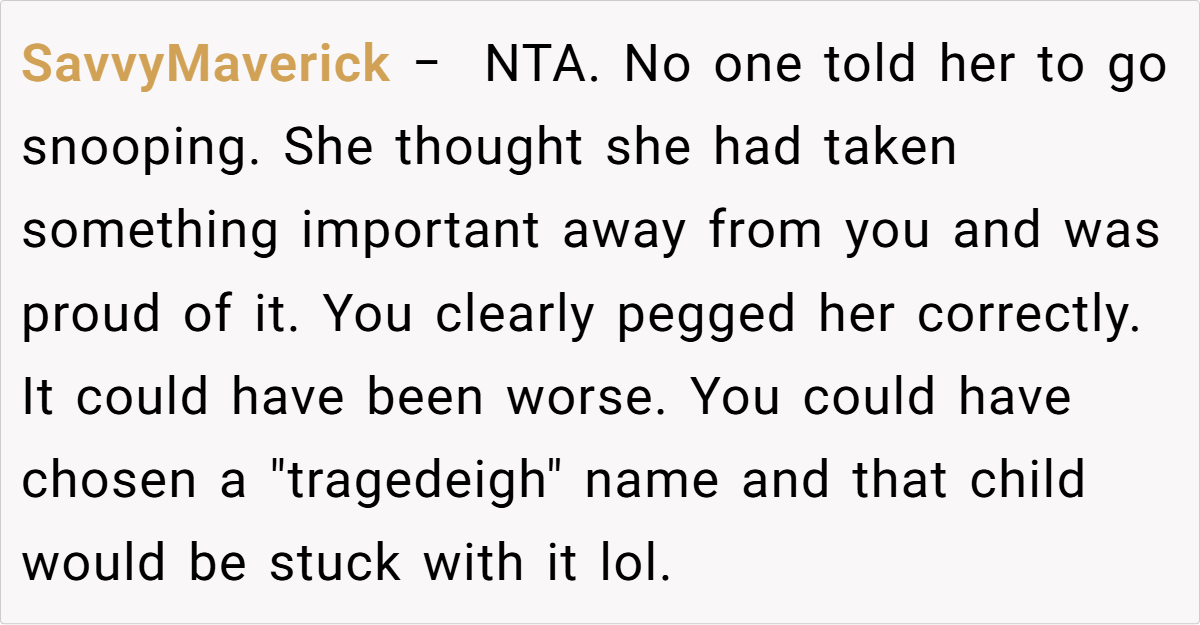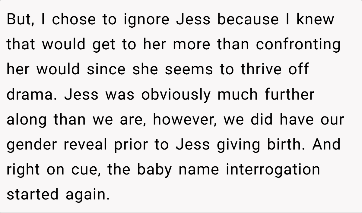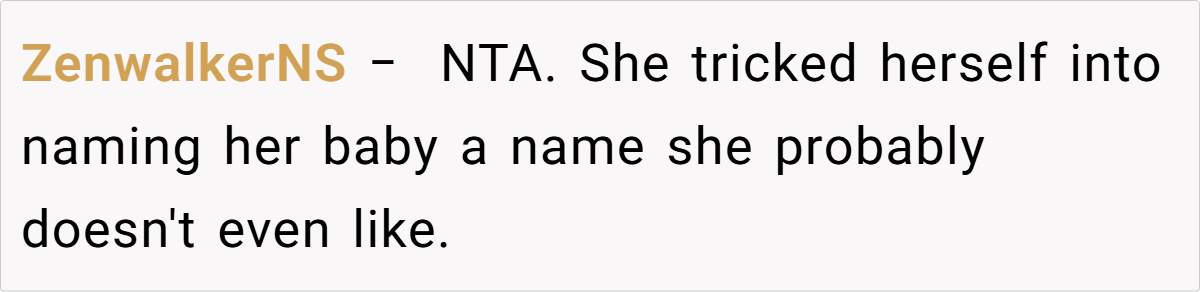 The unfolding drama reached its peak when Jess, in a moment of brazen mischief, claimed the very name the OP had planted as a test. Her over-the-top, smug reaction not only confirmed the OP’s concerns but also revealed a calculated attempt to manipulate family narratives. This incident, full of irony and dark humor, raises questions about boundaries, respect, and the impact of unresolved family rivalry on the most personal of choices.