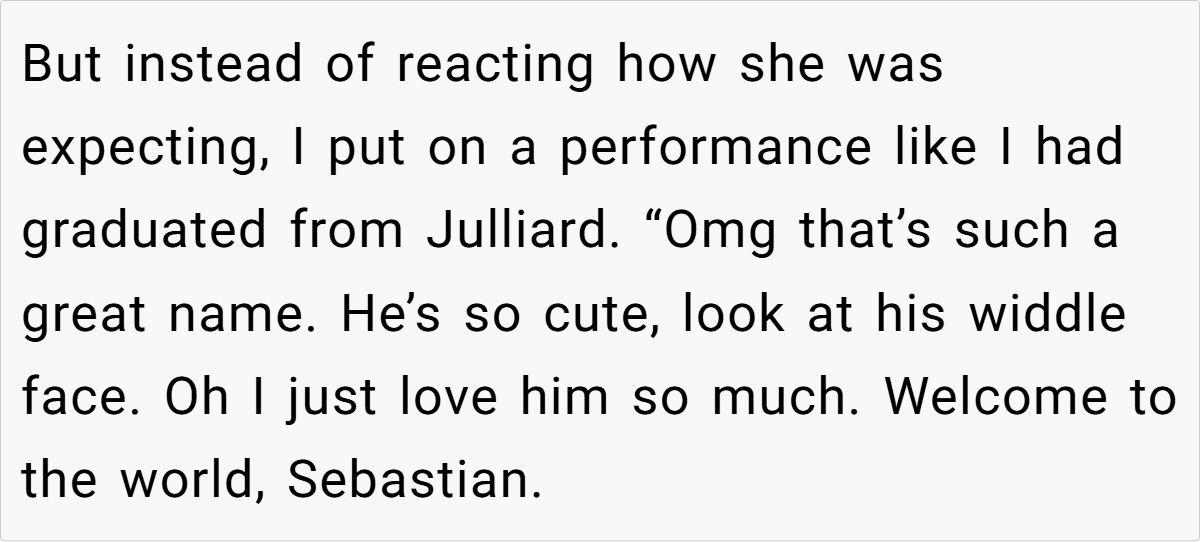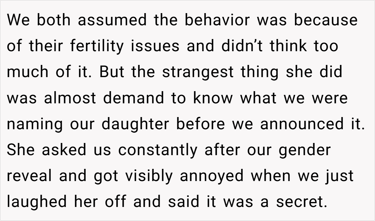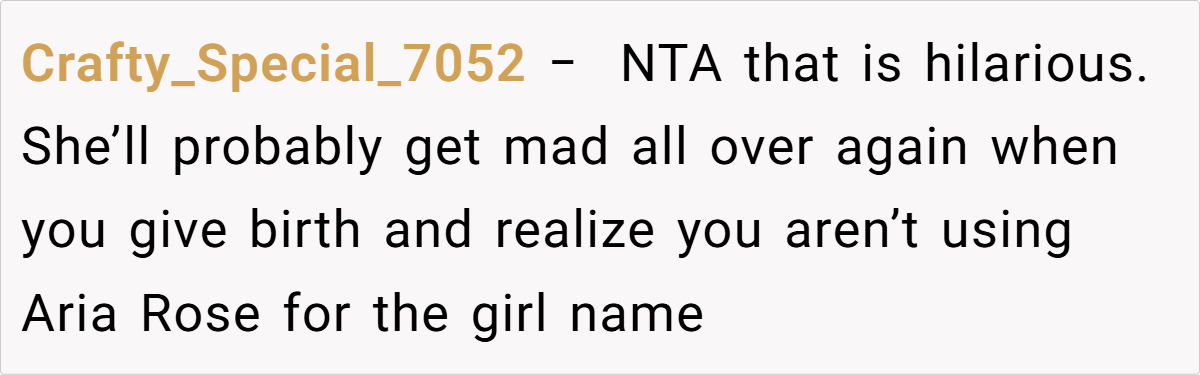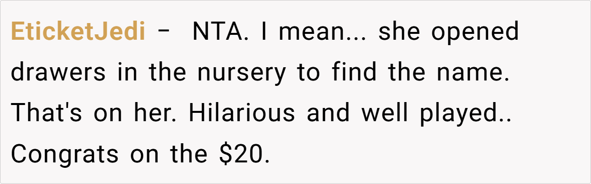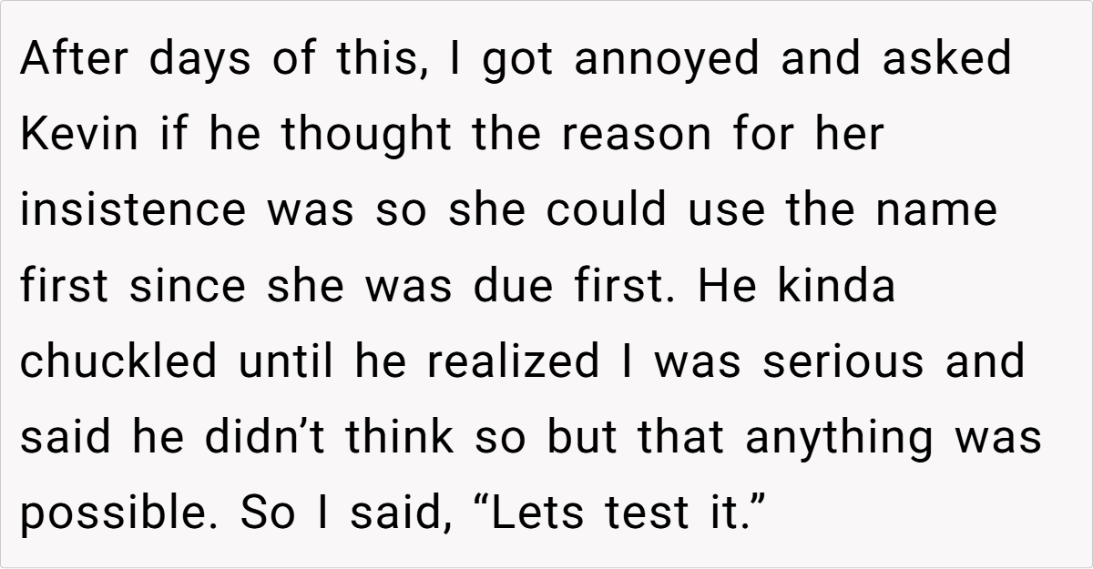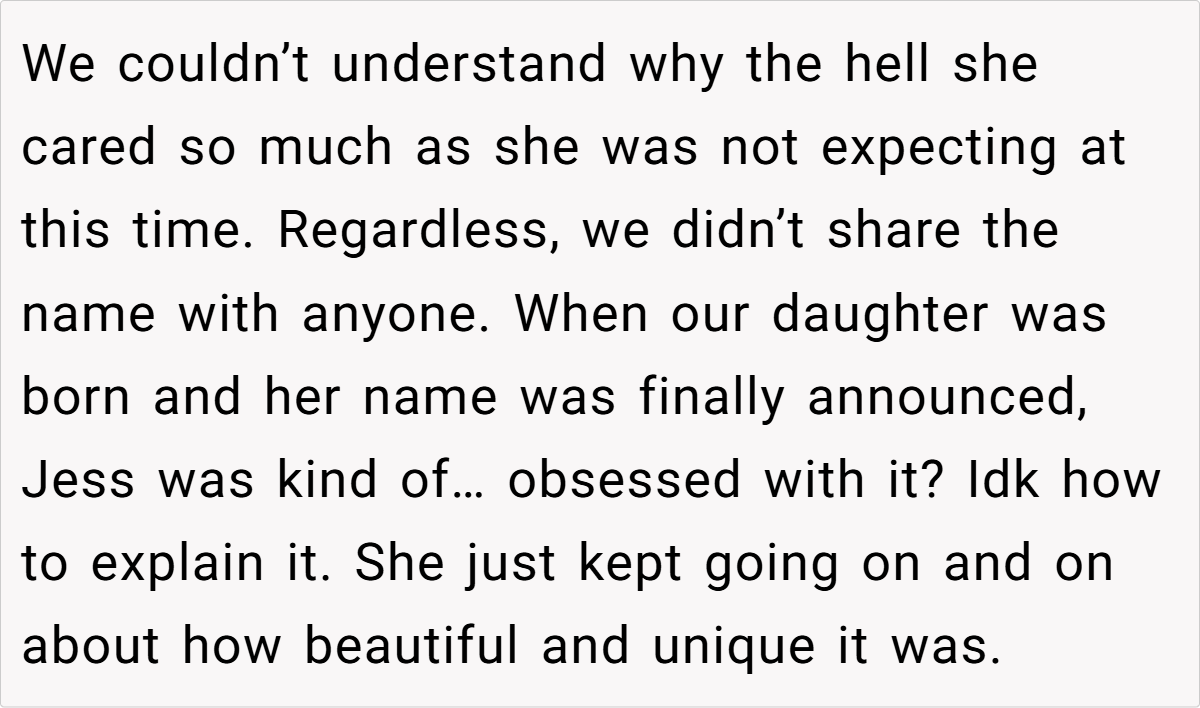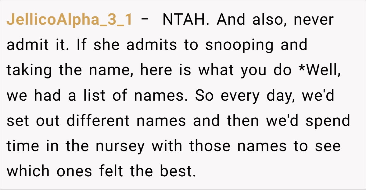 The unfolding drama reached its peak when Jess, in a moment of brazen mischief, claimed the very name the OP had planted as a test. Her over-the-top, smug reaction not only confirmed the OP’s concerns but also revealed a calculated attempt to manipulate family narratives. This incident, full of irony and dark humor, raises questions about boundaries, respect, and the impact of unresolved family rivalry on the most personal of choices.