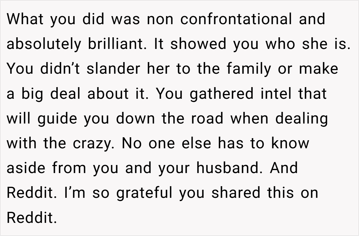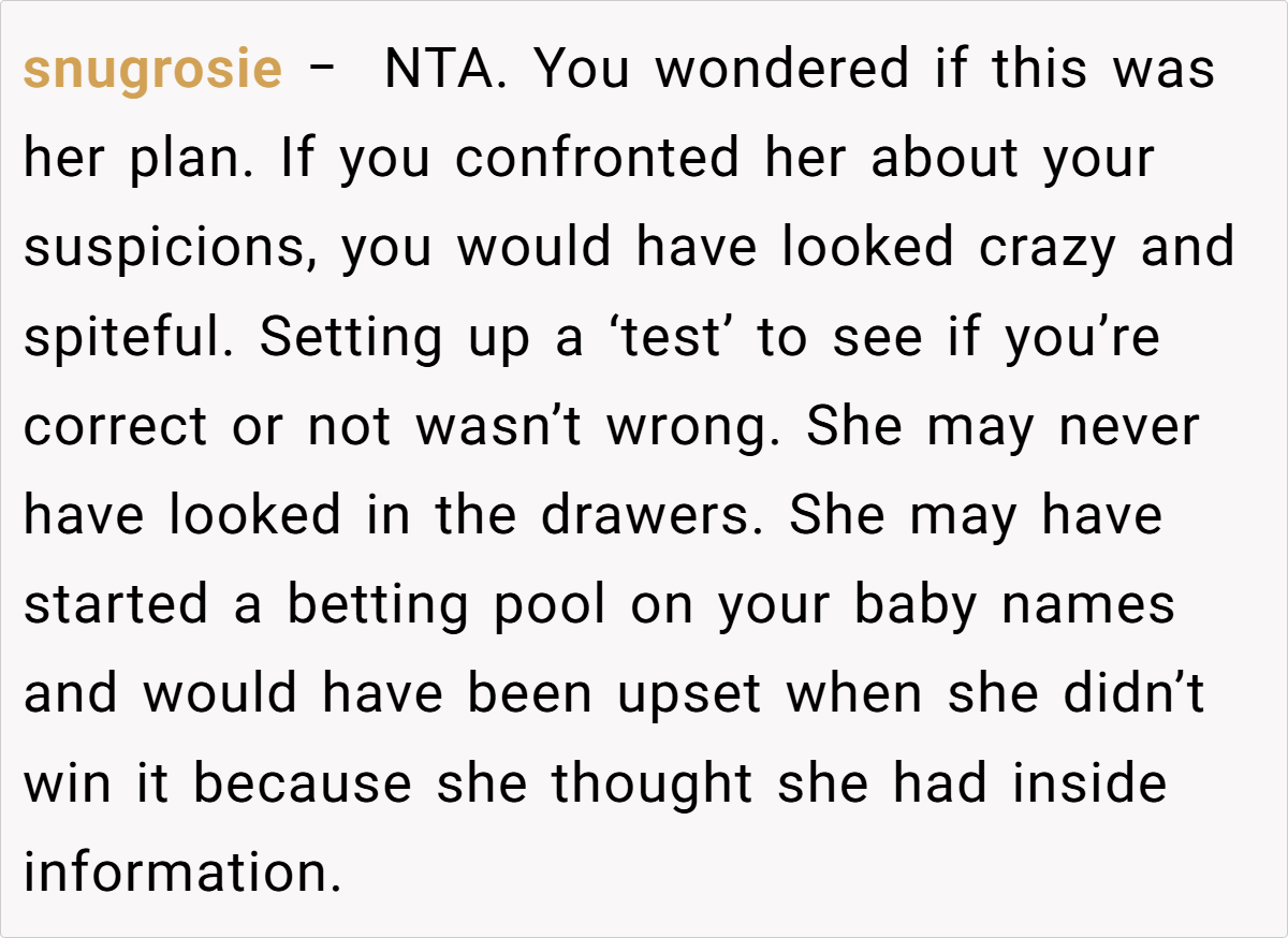 Across Reddit, responses to this saga were overwhelmingly supportive of the OP’s clever test. Many users applauded the creative approach to expose Jess’s manipulative behavior, describing the act as both hilarious and well-deserved. The consensus was that the sister-in-law’s repeated snooping and overbearing curiosity warranted a decisive—and humorous—response. While a few remarked on the potential for lingering family drama, most agreed that the OP’s actions were a justified means of setting boundaries in an otherwise toxic dynamic.
