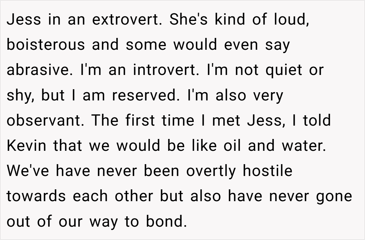 Furthermore, this incident brings into focus the challenges of coexisting with individuals who have contrasting personalities. While the OP is reserved and values privacy, Jess thrives on attention and often disrupts harmony with her boisterous behavior. This mismatch can lead to frequent misunderstandings and, in some cases, deliberate provocations.