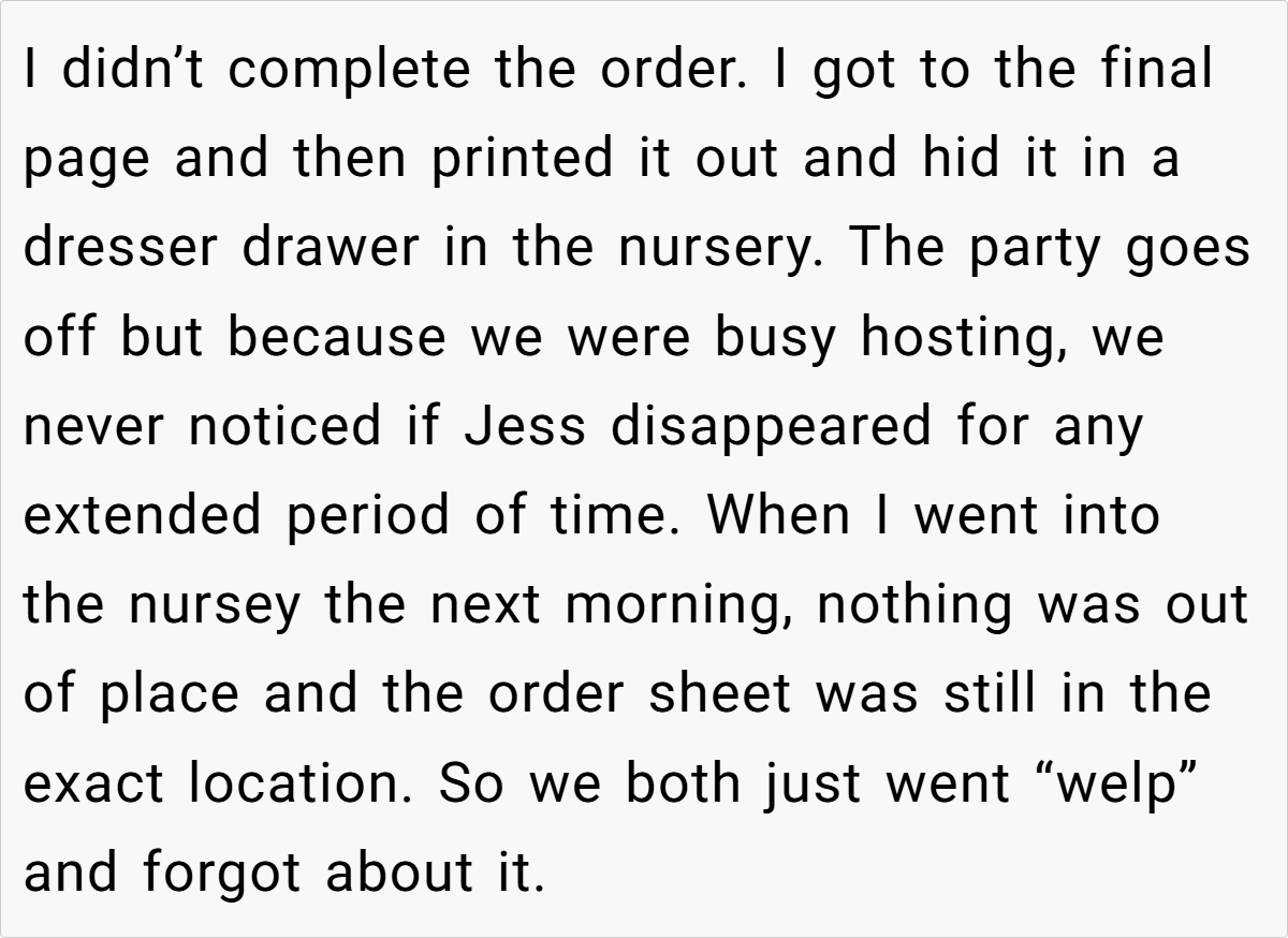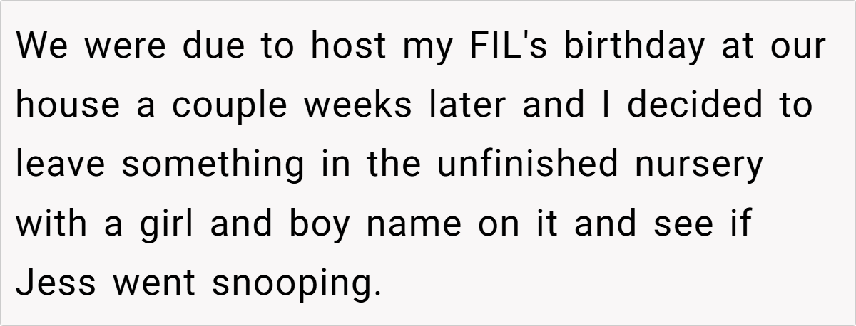 When the OP decided to test her suspicions by leaving a hidden wall decal order in the nursery, it set the stage for a vindictive twist that would expose underlying tensions and leave everyone, especially her husband, both amused and astonished.