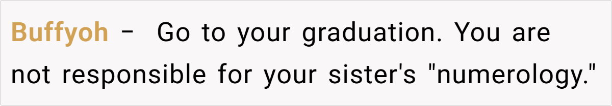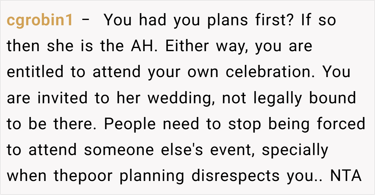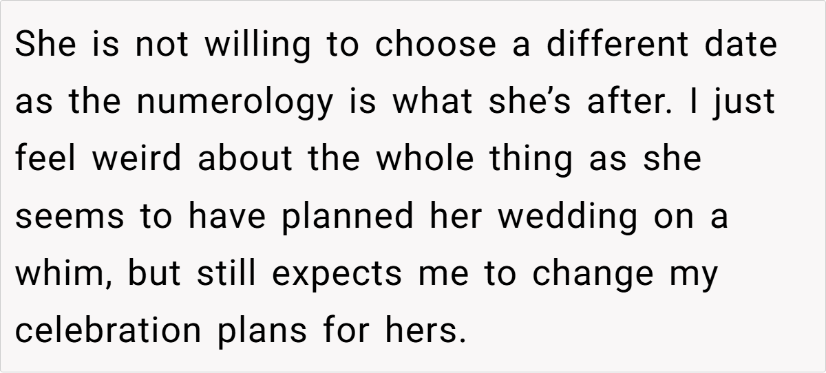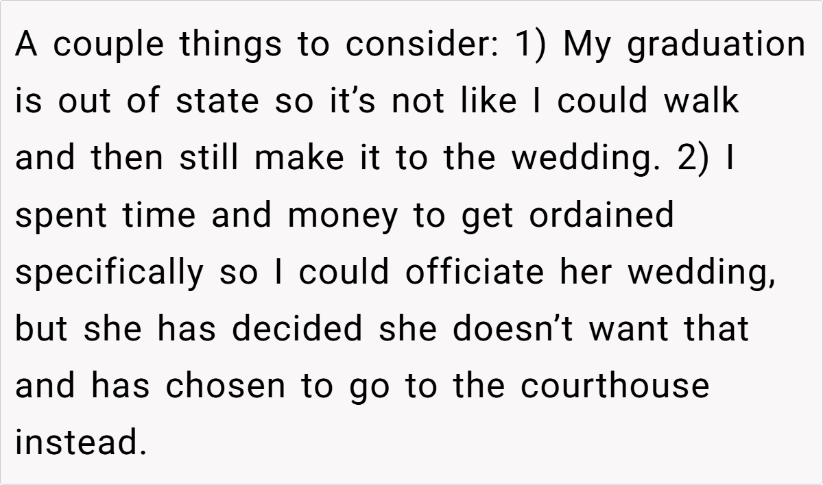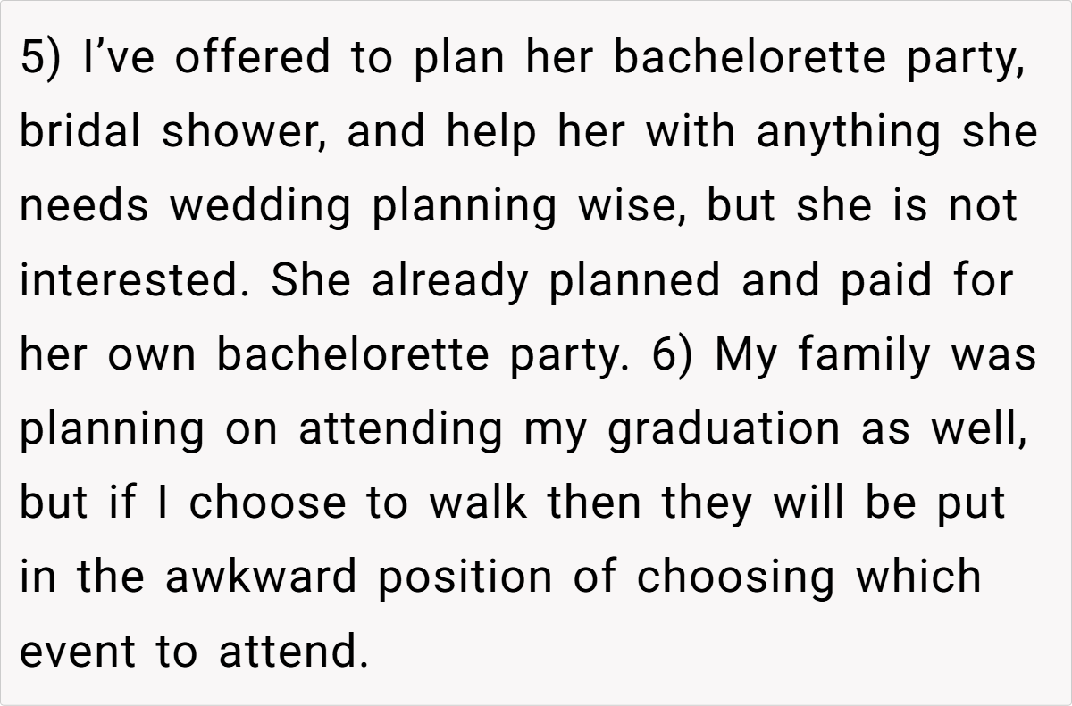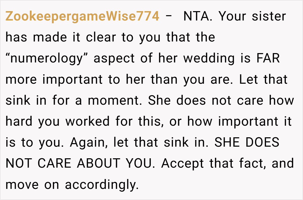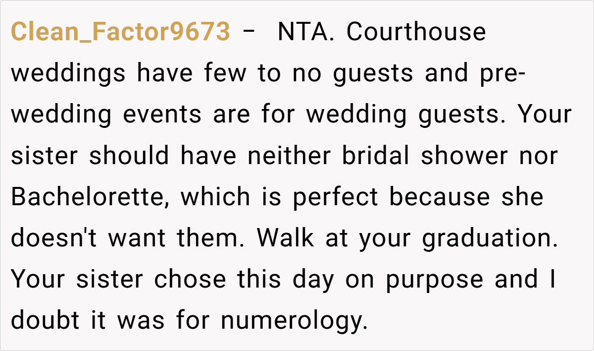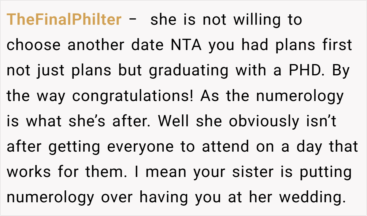 Breaking down the scenario further, the post shows clear opposing perspectives. On one side, the individual has spent years envisioning and preparing for the graduation—a moment that symbolizes hard-won academic success and self-realization. On the other, the sister’s wedding, though a smaller and less extravagant affair, carries a weight of familial expectation. The sibling’s refusal to adjust her wedding date based on numerological beliefs only deepens the complexity of the decision. In families where time and resources are limited, even small events can carry enormous emotional stakes.