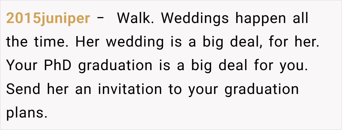 Let’s start with a simple thought: “Letting your partner or family in on your life’s milestones can be as daunting as it is exhilarating.” In this situation, the choice between a PhD graduation and a sister’s wedding highlights the difficulty of balancing personal achievement with family obligations. Many relationship experts point out that conflict is inevitable, yet managing it is key.