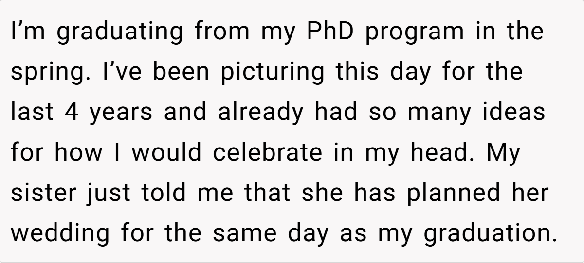 ‘AITAH If I Choose to Go My PhD Graduation Instead of My Sister’s Wedding?’