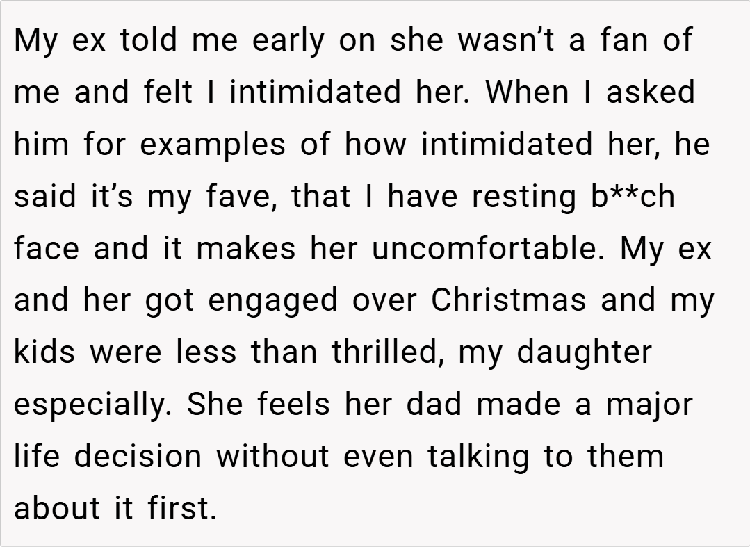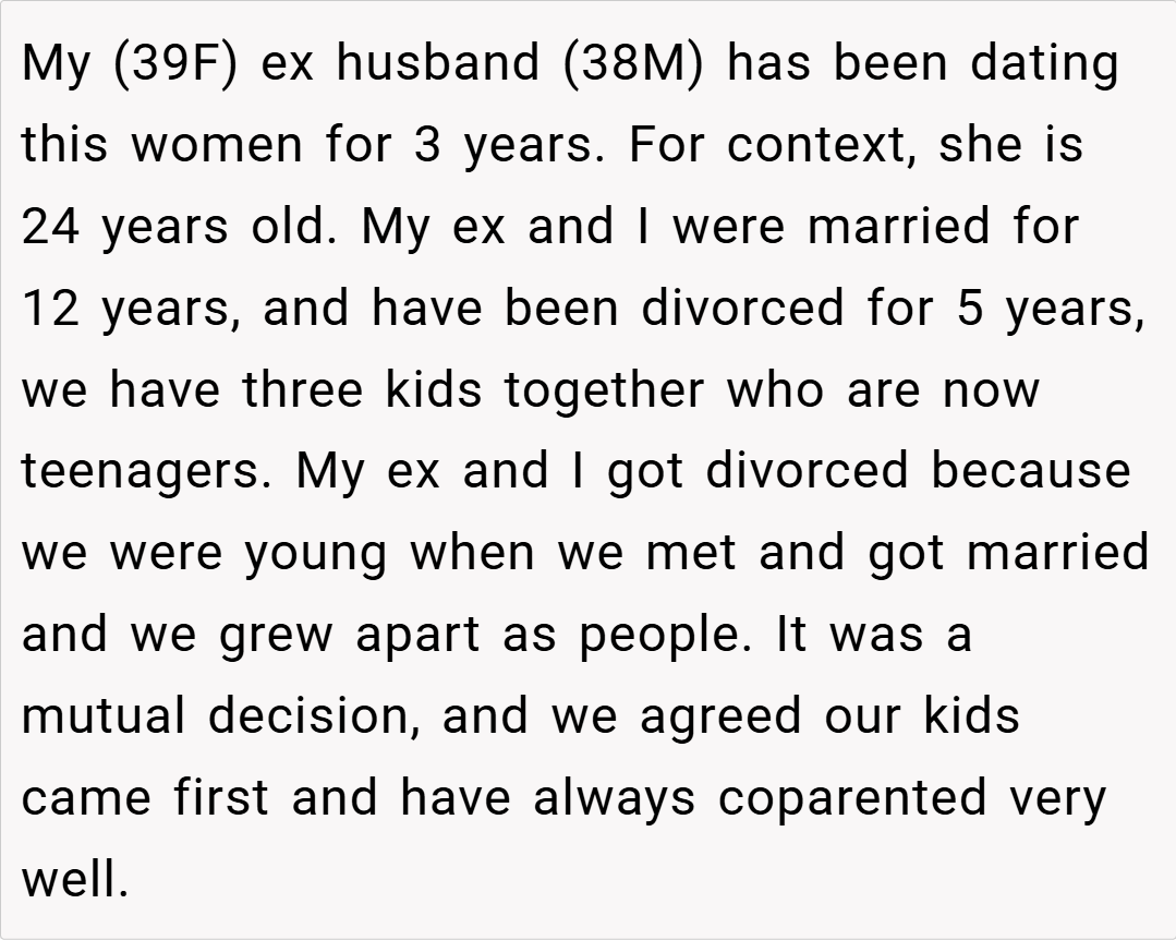 she’s happily co-parenting three teenagers with her ex-husband. However, his new fiancée—a 24-year-old who’s been part of his life for the past three years—has raised an eyebrow at the idea of sharing the same last name with her ex. The fiancée finds it “awkward” for the ex-wife and her to share a surname, a sentiment that has led her ex to insist on a name change.