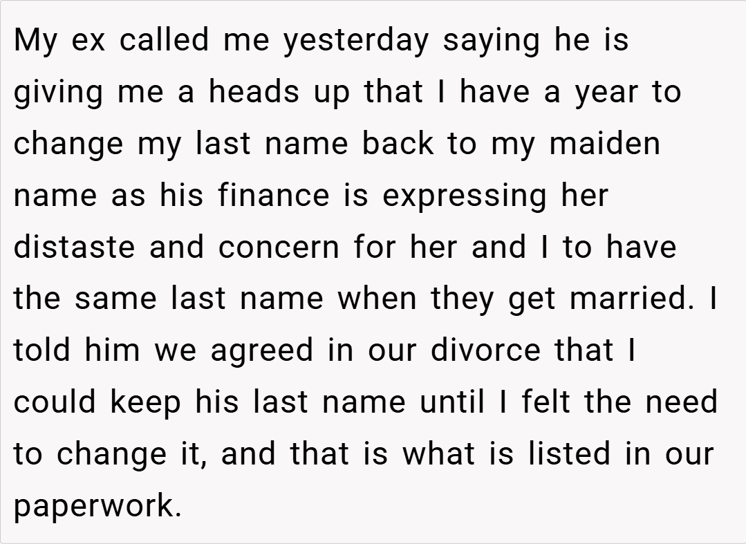 ‘AITAH? My (39F) Ex husband (37M) is insisting I change my last name back to my maiden name because his new fiancé (24F) feels it will be awkward for her and I to have the same last name. AITAH for refusing to change it?’