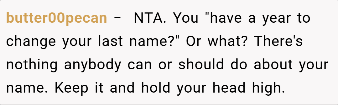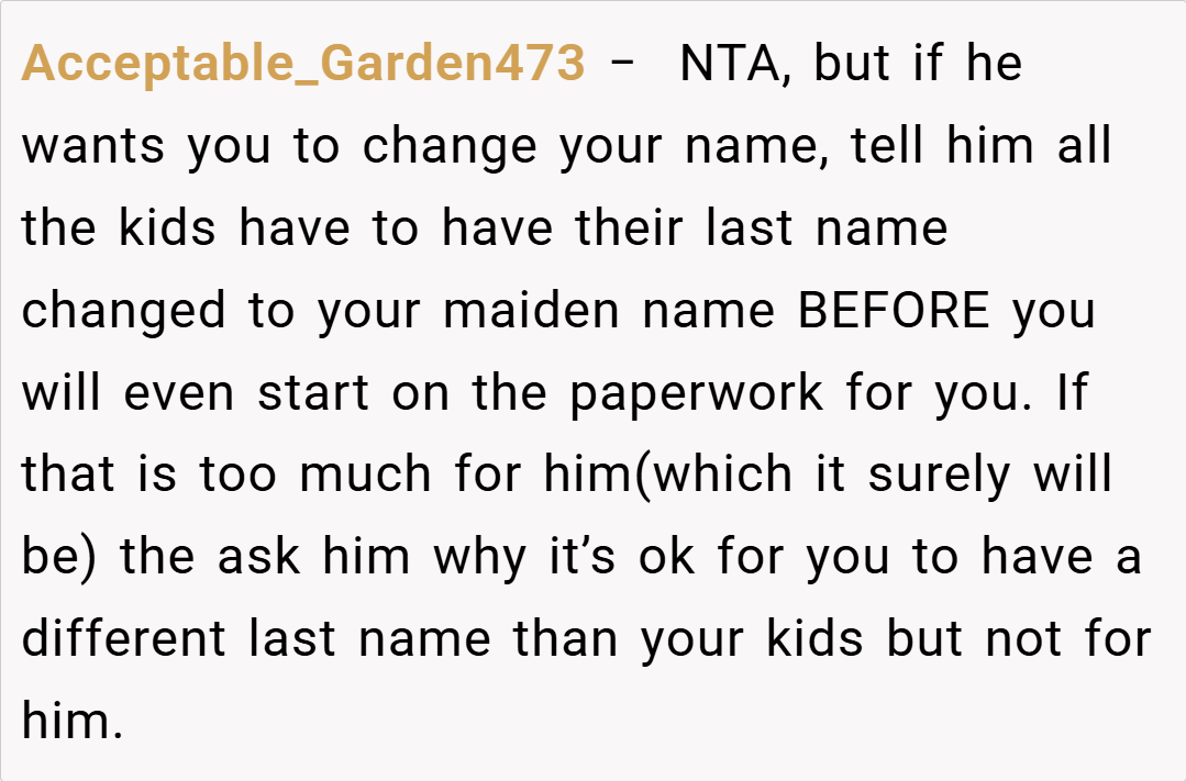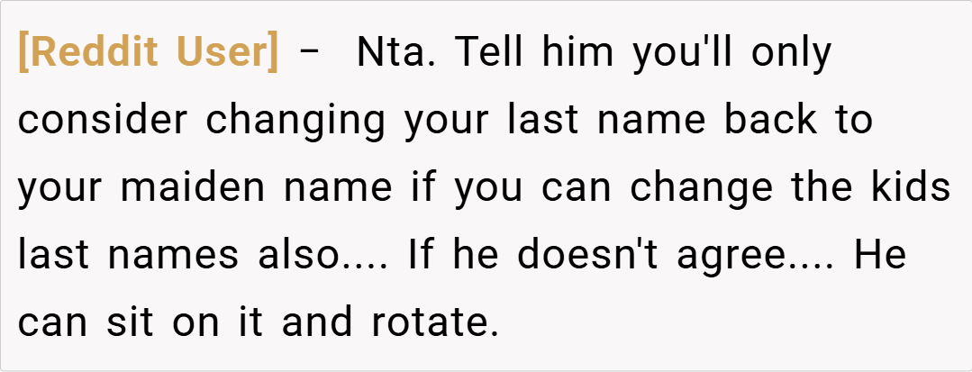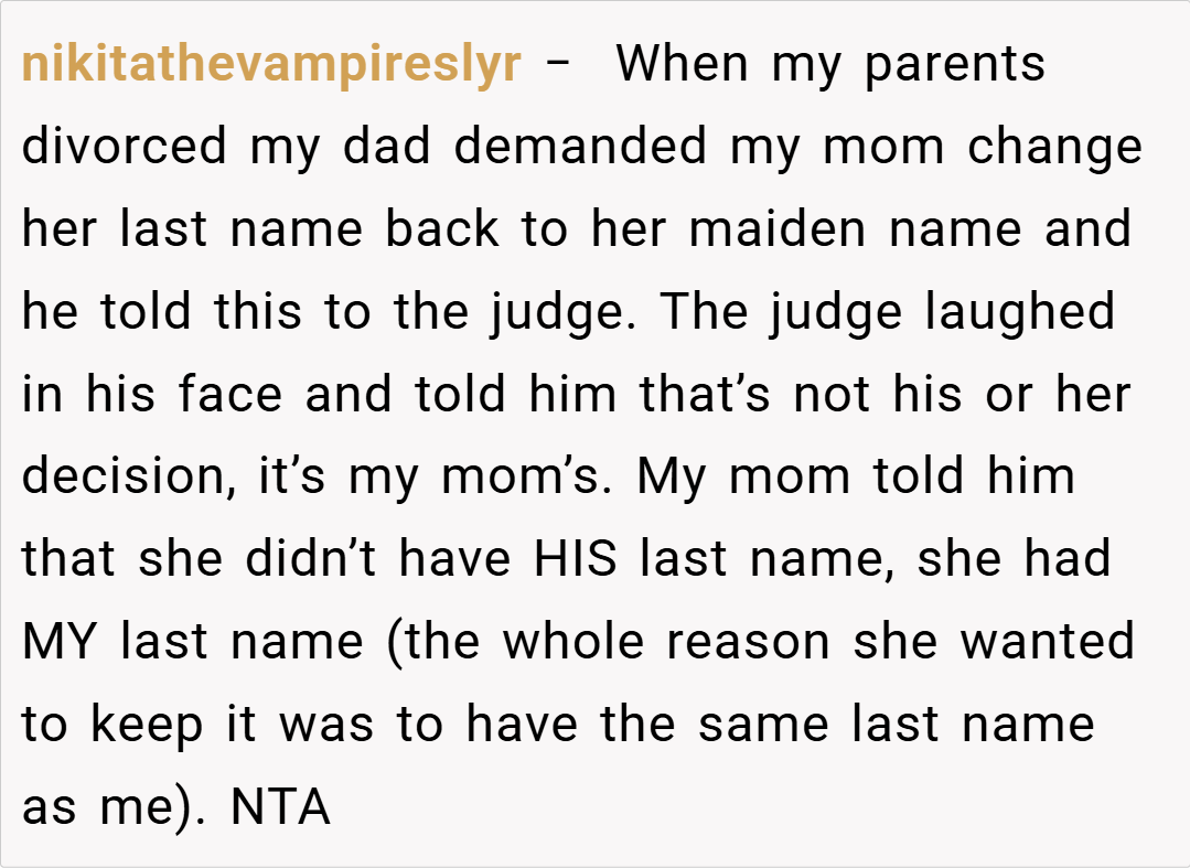 This request has set off a storm of emotions and questions about personal identity, respect, and fairness. The ex-wife reminds him of their divorce agreement, which allowed her to retain his last name until she chose otherwise, and she’s adamant about keeping it for the sake of family unity with her kids. With tensions running high at family events and co-parenting gatherings, she now faces the ultimate question: Am I the a**hole for refusing to change my last name?