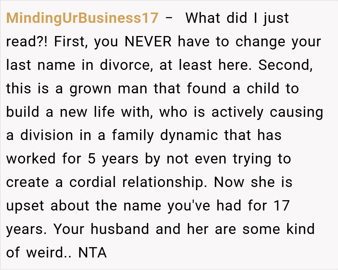 The ex-wife’s refusal to change her last name is not an act of defiance but a defense of her own well-being and that of her children. It highlights the need for mutual respect and understanding in co-parenting and blended family dynamics. Healthy co-parenting and respectful ex-partnerships hinge on recognizing that shared responsibilities do not necessitate a loss of individual identity.