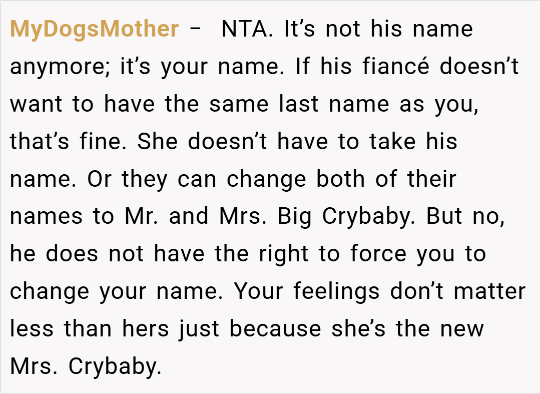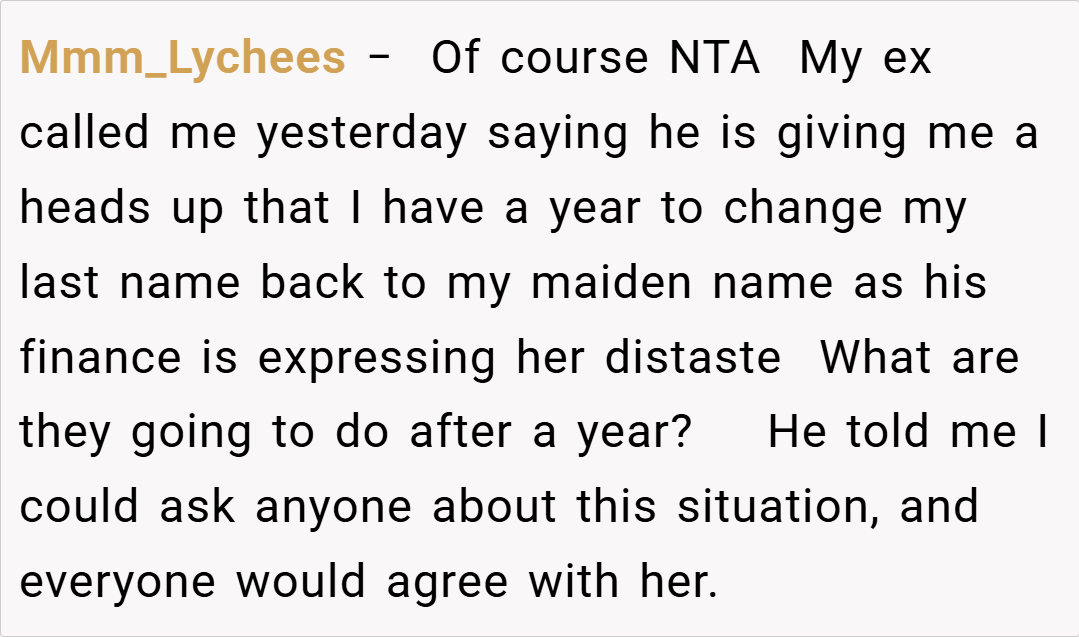Many redditors sympathize with the ex-wife’s desire to honor her identity and maintain family unity, arguing that her name is an intrinsic part of who she is. Others believe that adjusting to new family dynamics might require a bit of compromise, even if it feels uncomfortable. The conversation reveals a divided but passionate community, with many questioning whether the fiancée’s preferences should override established agreements and personal legacy.