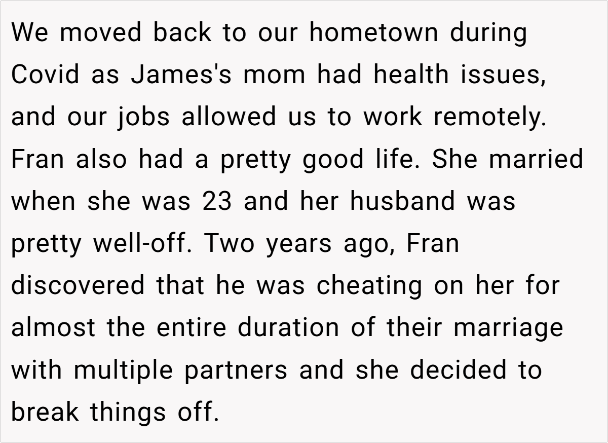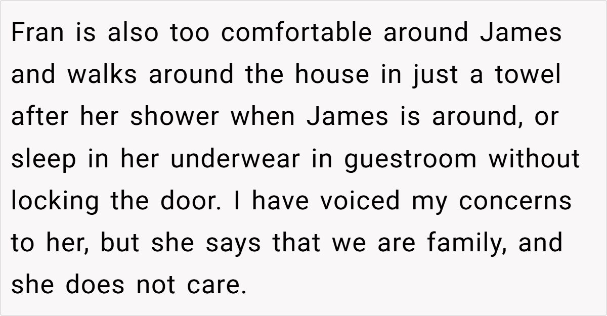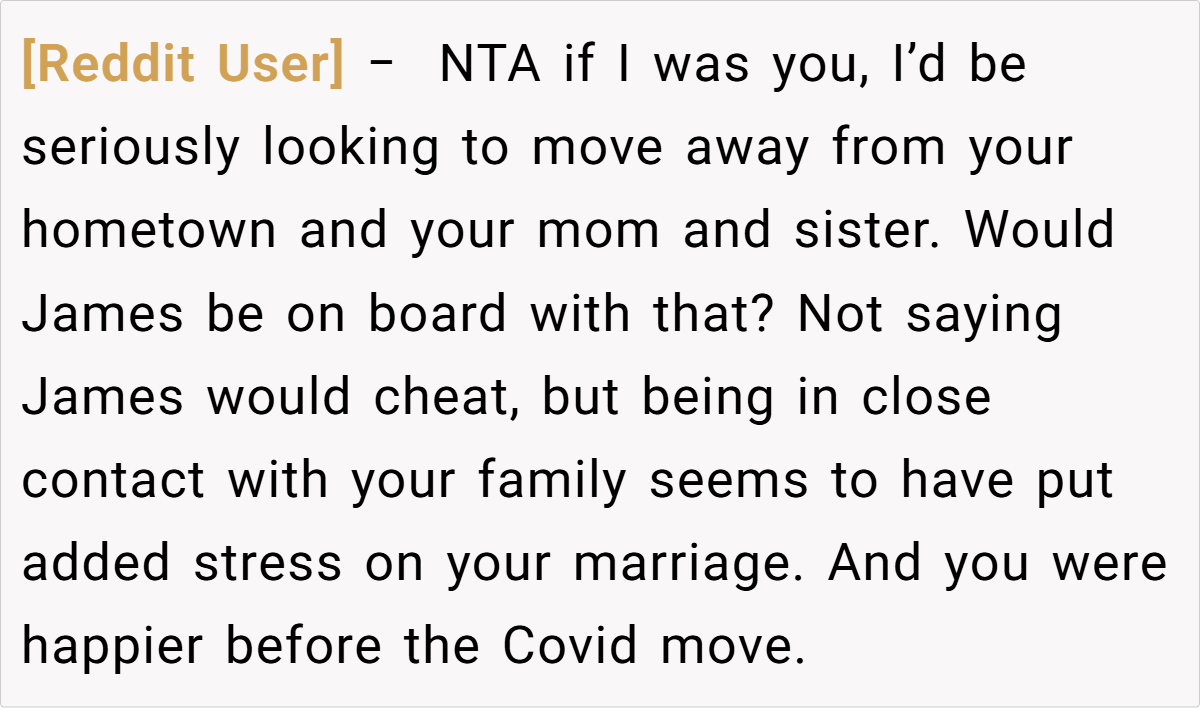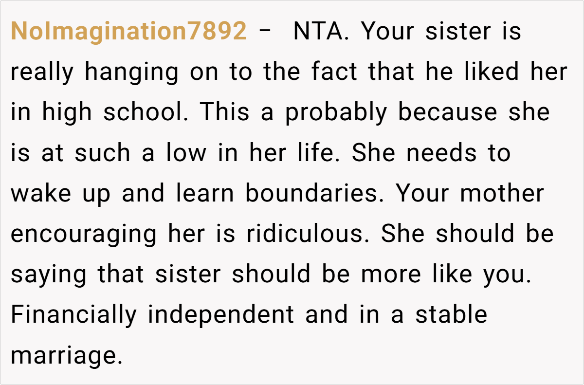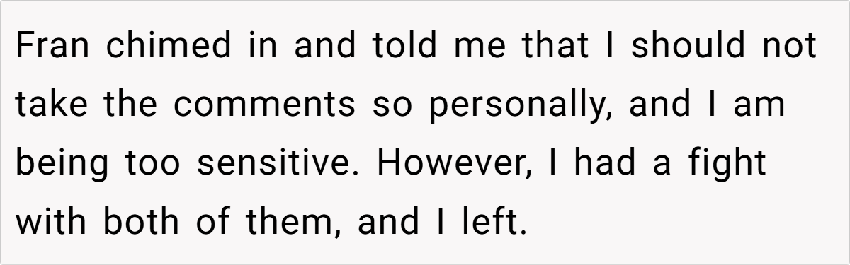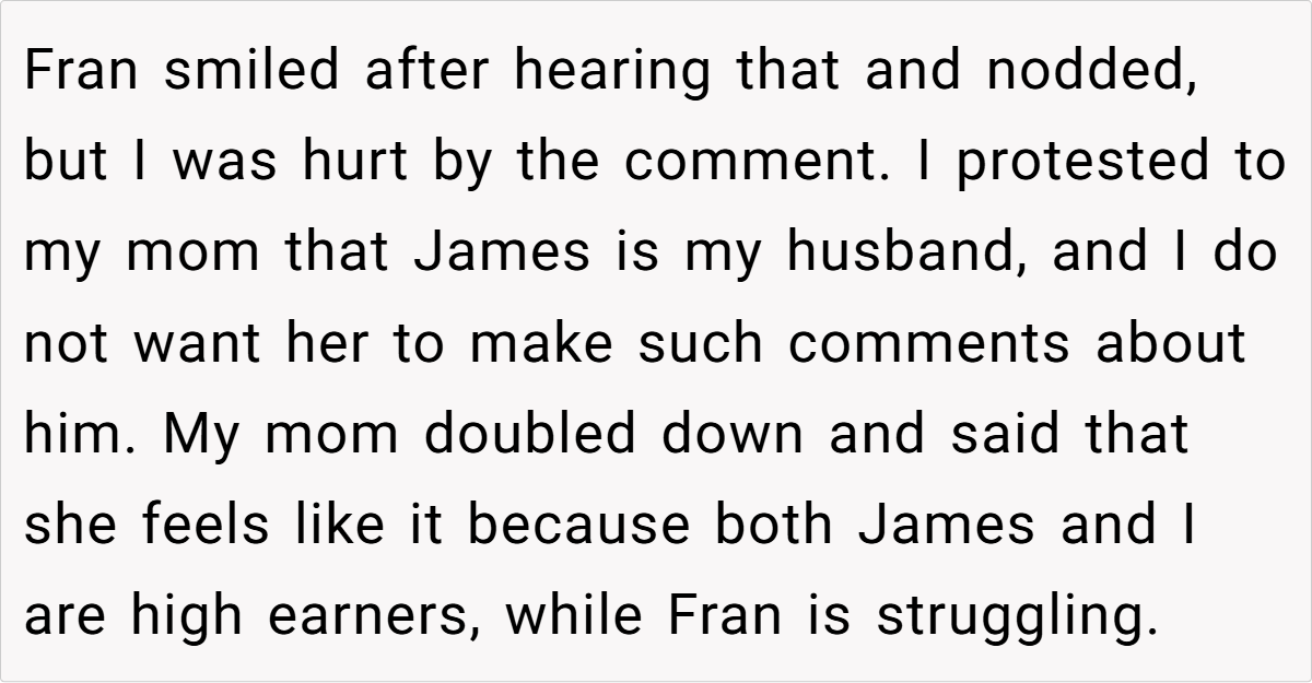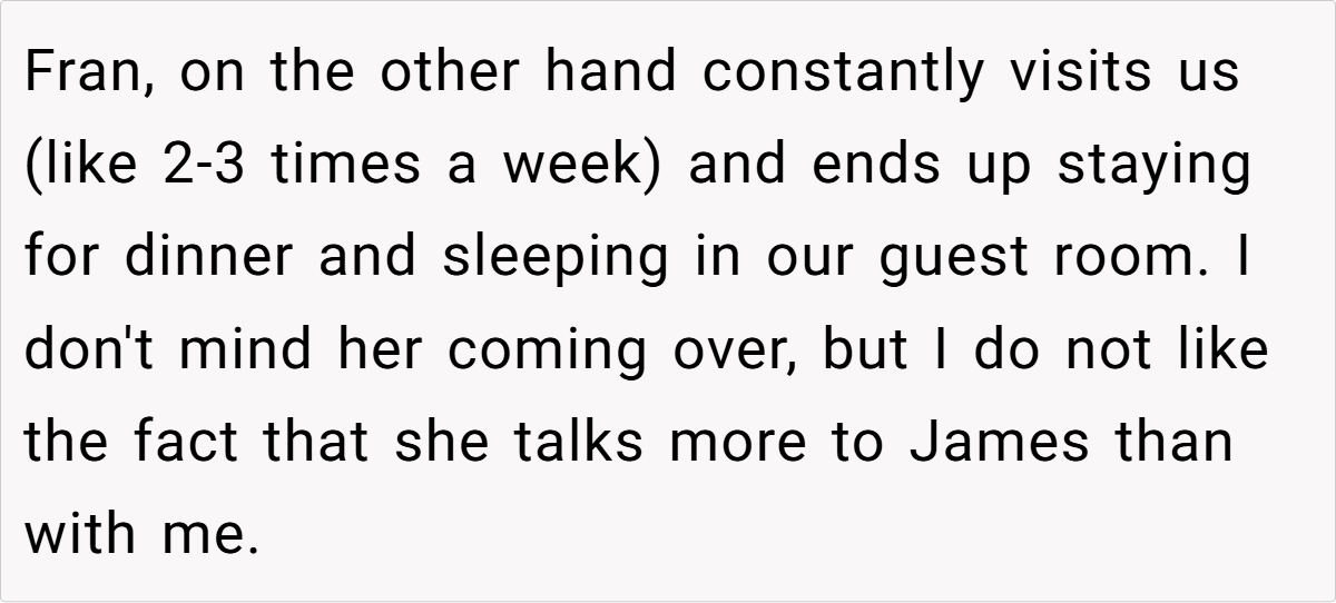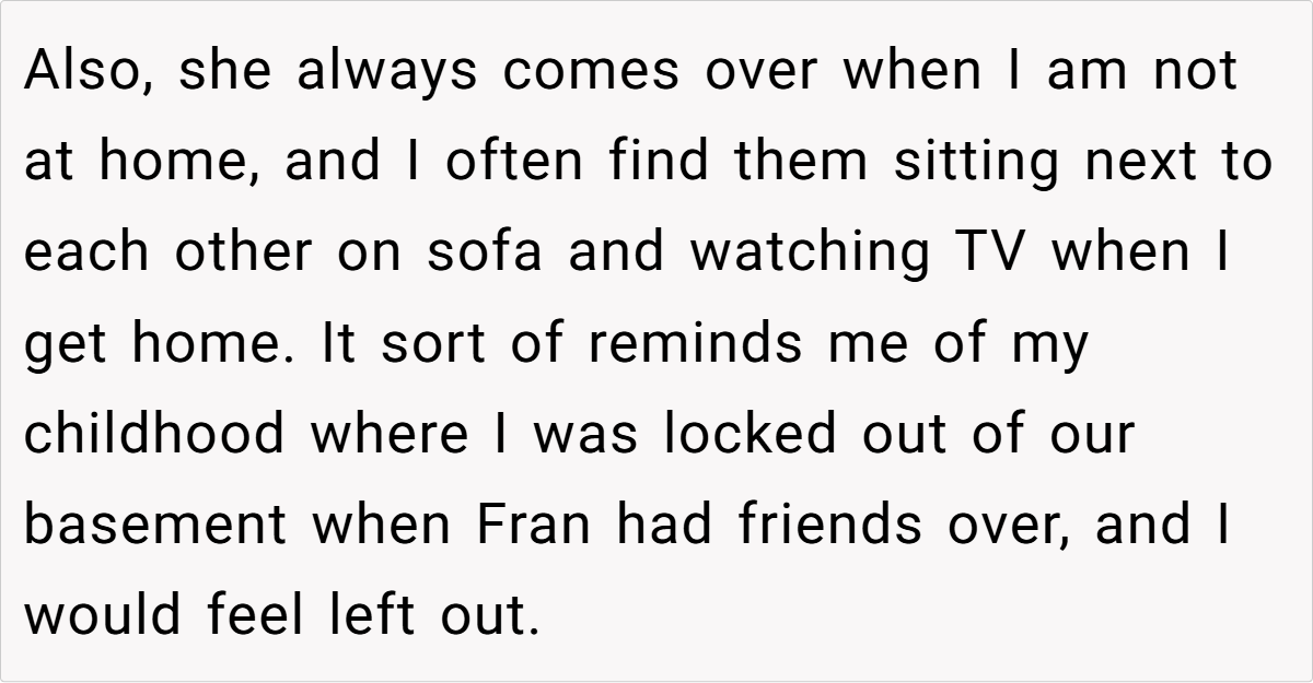 Analyzing this situation, it’s clear that the hurtful comment made by the mother is not just an offhand joke. It taps into a history of feeling sidelined within the family dynamic, reminiscent of childhood memories of being left out. The sister’s overly familiar behavior around the husband only deepens the sense of intrusion, making it harder for our storyteller to feel secure in her own home.