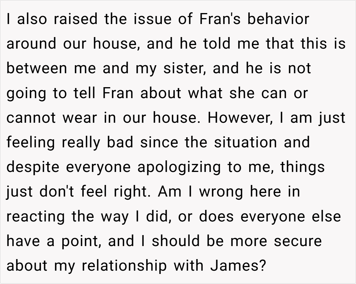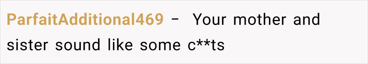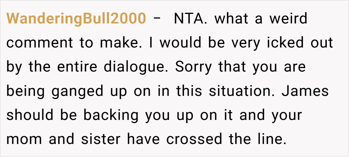 There is widespread agreement that the sister’s behavior, combined with the mother’s insensitive remarks, is not just harmless fun but a recurring pattern that needs addressing. Several voices emphasize that the husband should be more supportive and protective of his wife’s feelings. Ultimately, the prevailing sentiment is that her reaction is justified, and her concerns about maintaining marital respect are entirely valid.