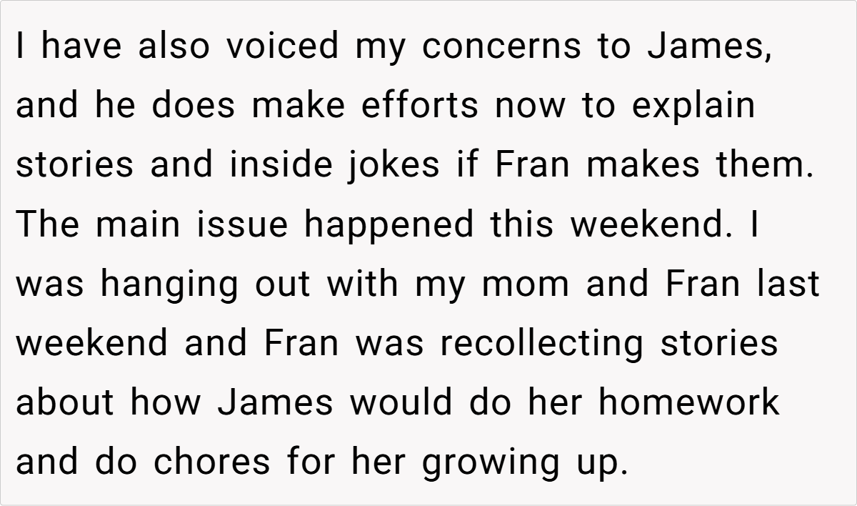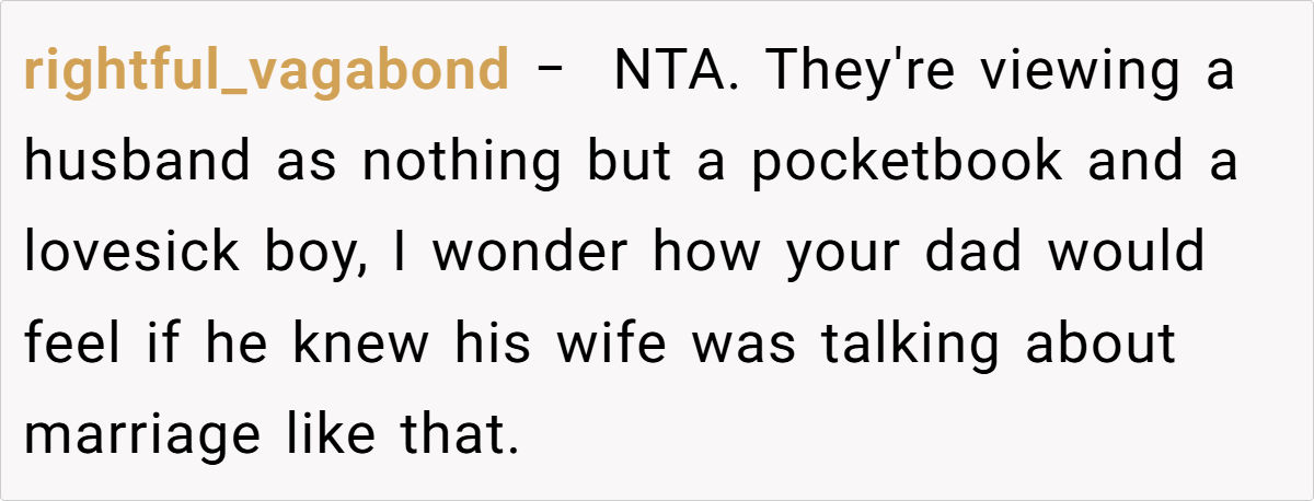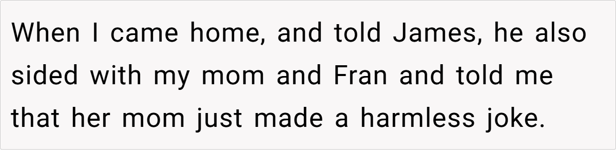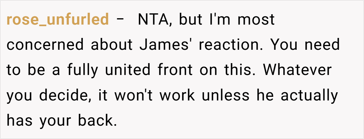 The expert perspective here isn’t about labeling anyone as right or wrong but about recognizing that emotional security in a relationship comes from both partners feeling respected. If the casual banter and offhand comments undermine that respect, they need to be reexamined. For those in similar situations, professional counseling can provide a safe space to navigate these complex family ties, ensuring that everyone’s feelings are acknowledged and boundaries are clearly defined.
