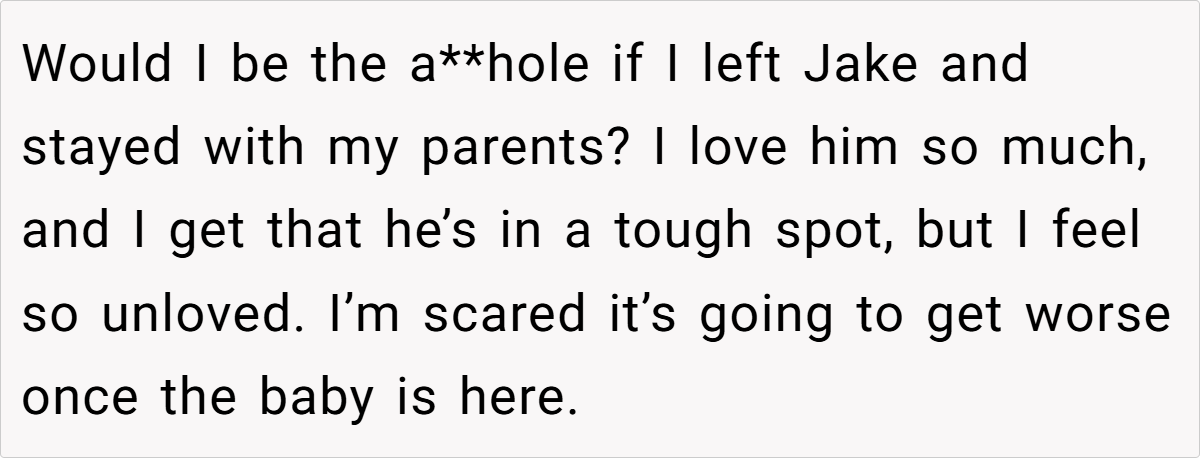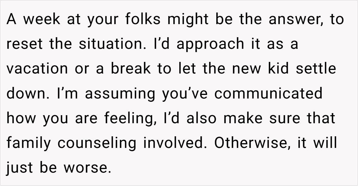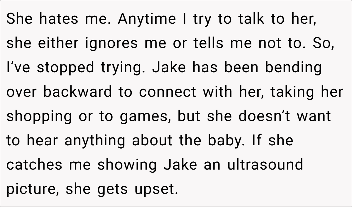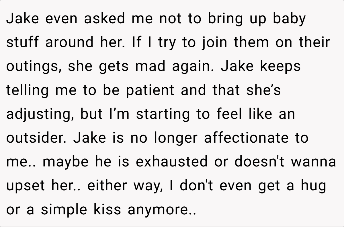 Her husband’s well-intentioned efforts to connect with his stepdaughter, such as giving her the baby’s room and altering family routines, have inadvertently left her feeling excluded and emotionally isolated, especially with a baby on the way.