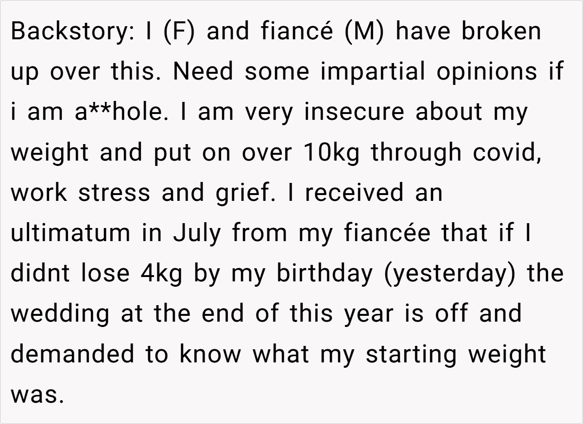 In relationships, vulnerabilities can become battlegrounds—especially when it comes to personal insecurities. For one woman, weight has always been a sensitive topic. After gaining over 10 kg during a tough period of COVID, work stress, and grief, her fiancé issued an ultimatum: lose 4 kg by her birthday or the wedding is off—and he demanded to know her starting weight. Overwhelmed and deeply hurt,