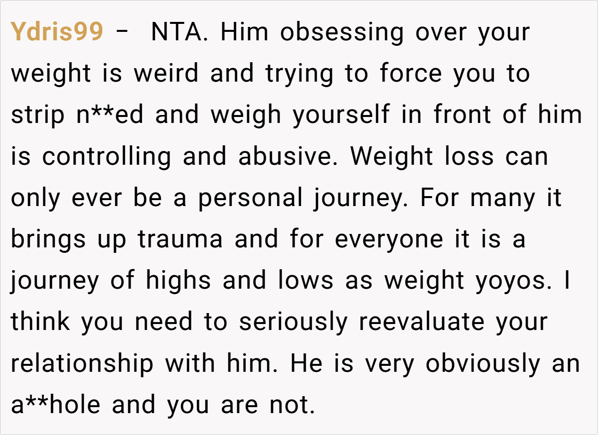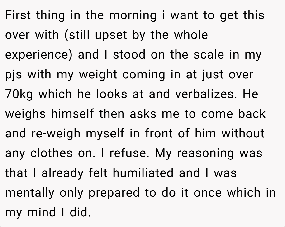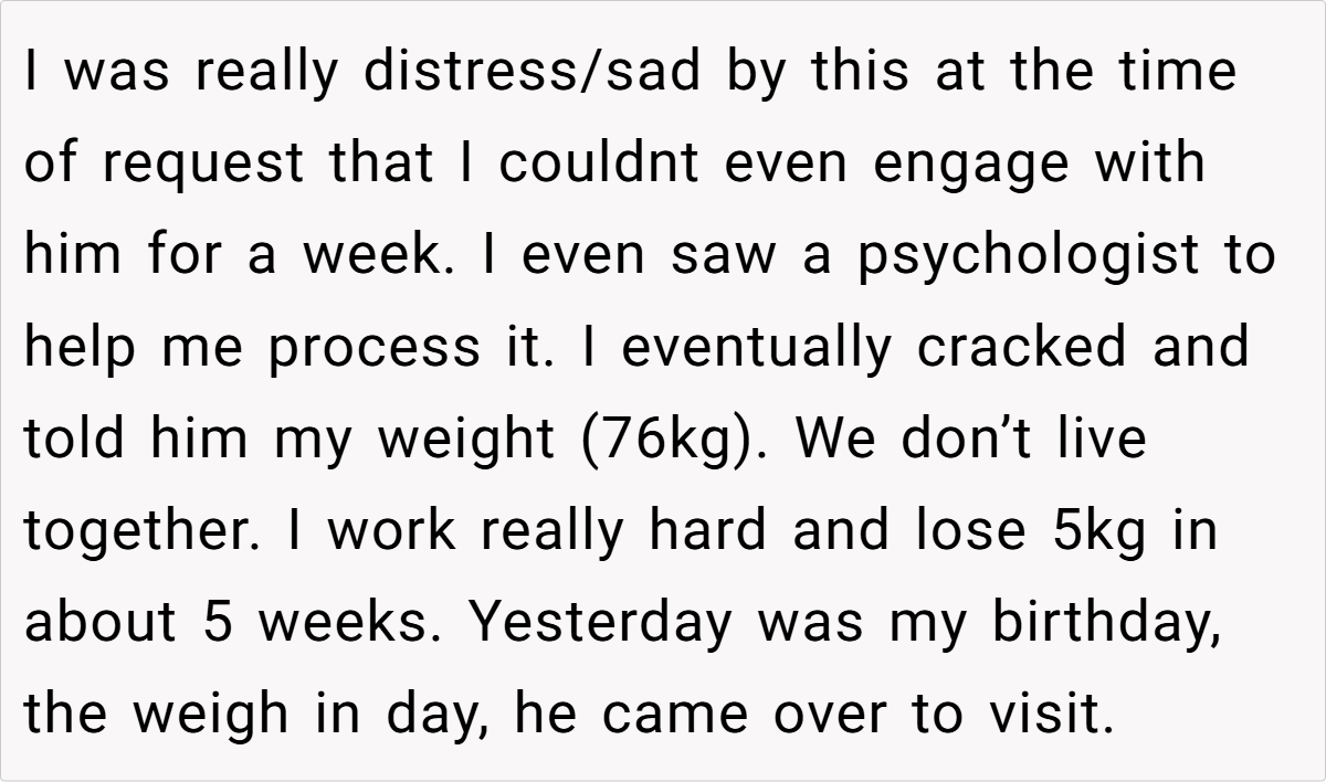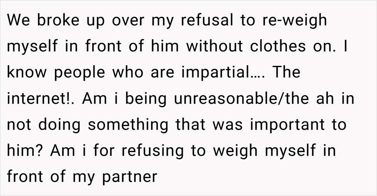she eventually confided her weight and even sought professional help. Despite working hard to shed some pounds, the situation escalated when, on her birthday morning, he insisted she re-weigh herself naked in front of him. For her, that moment felt like yet another act of humiliation and control. When she refused, he accused her of not caring about his safety concerns, and their relationship ultimately broke down. But is she in the wrong for refusing his demand?