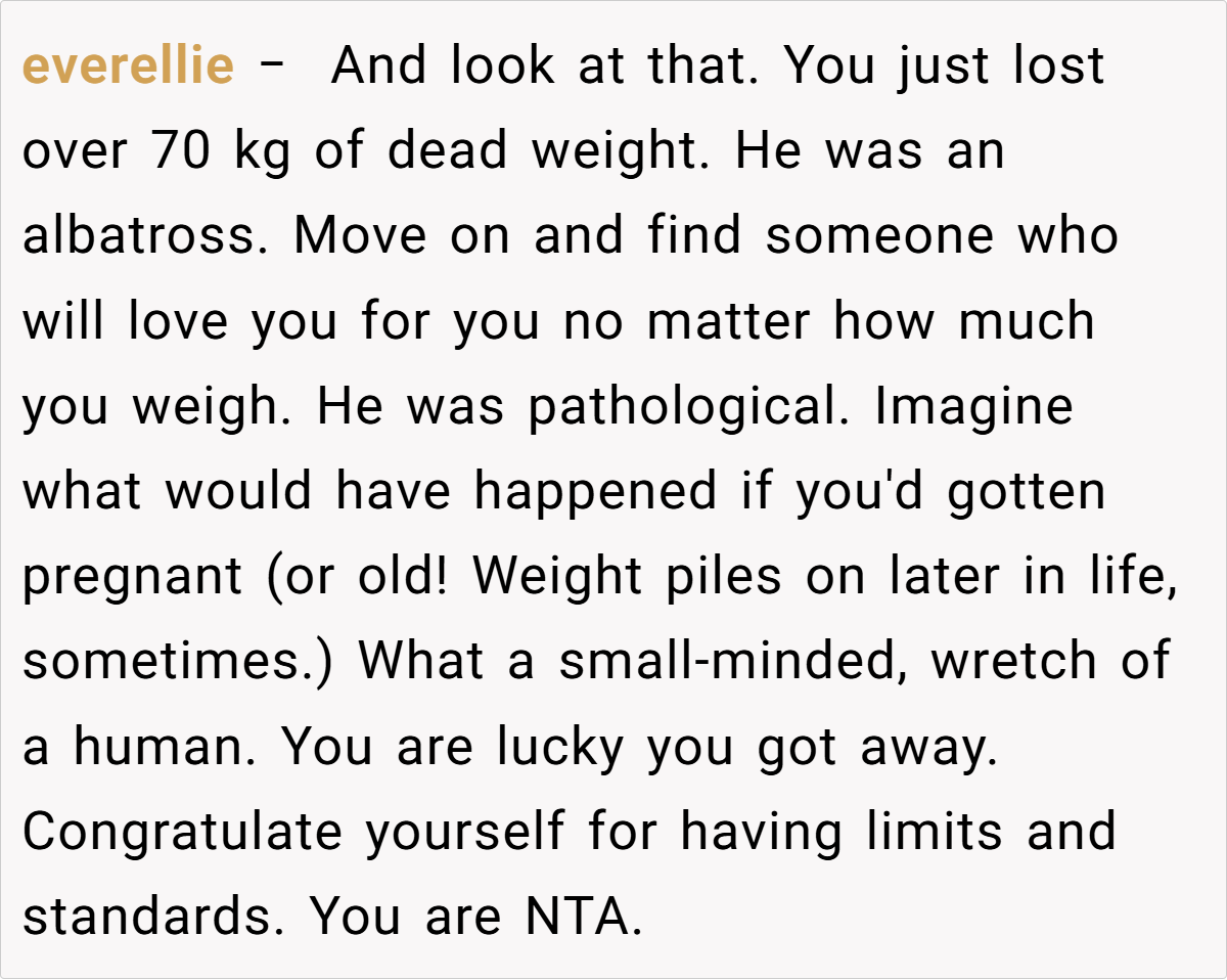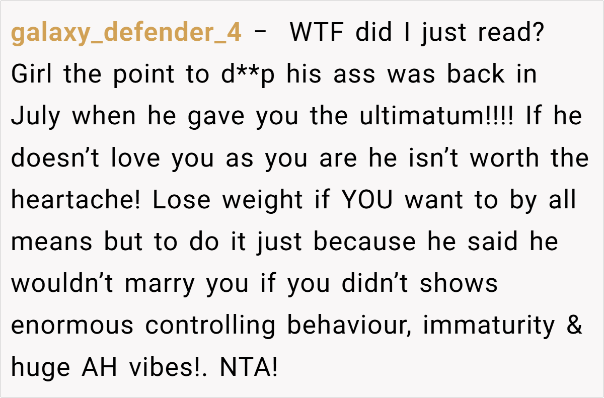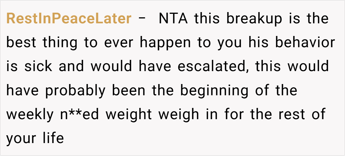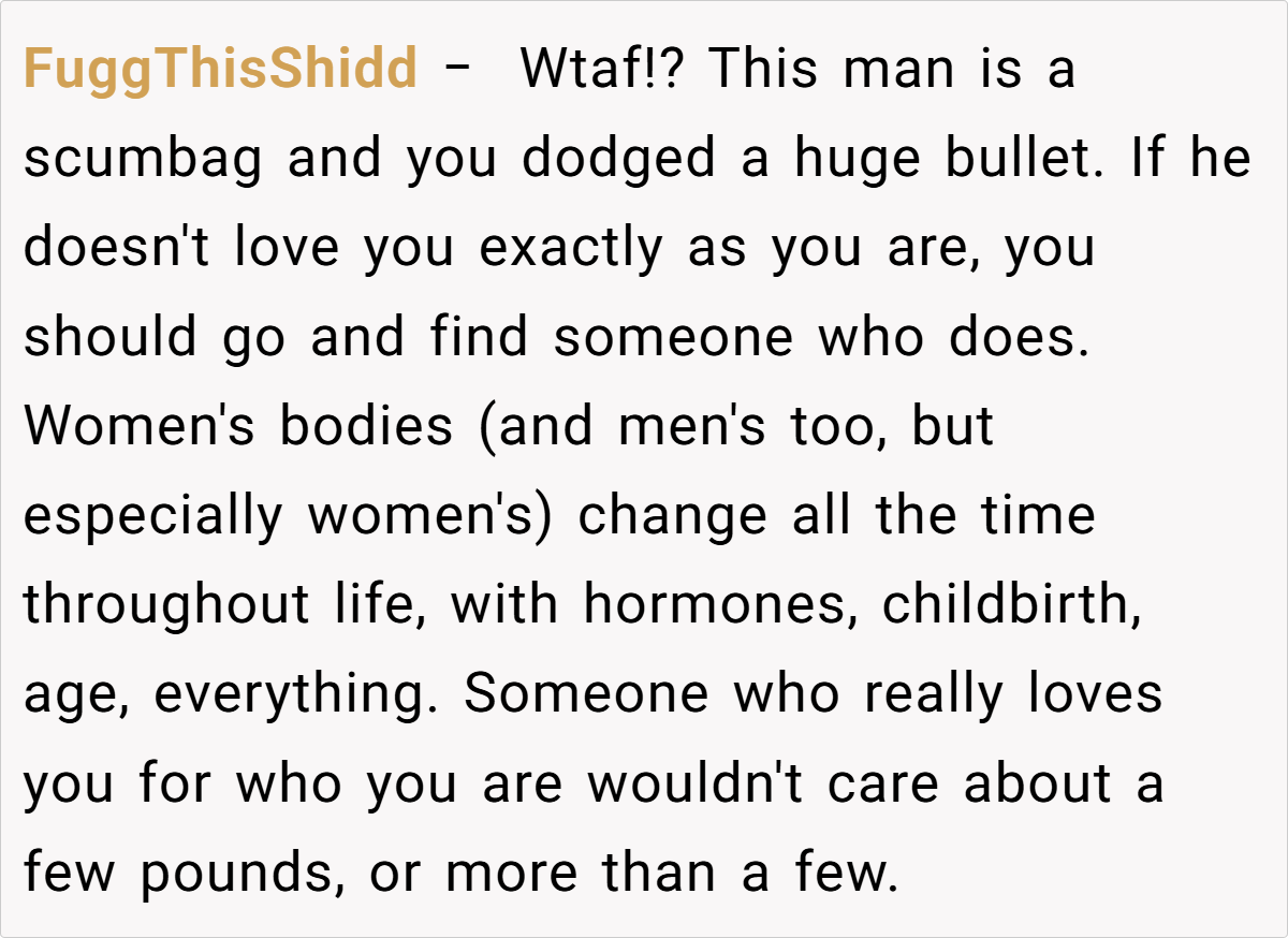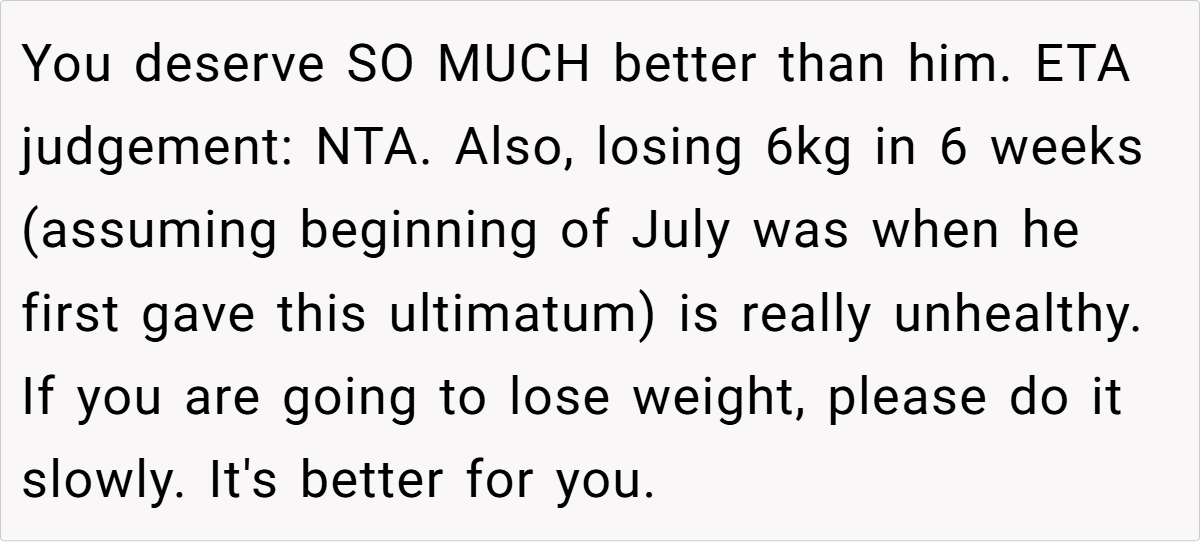 she eventually confided her weight and even sought professional help. Despite working hard to shed some pounds, the situation escalated when, on her birthday morning, he insisted she re-weigh herself naked in front of him. For her, that moment felt like yet another act of humiliation and control. When she refused, he accused her of not caring about his safety concerns, and their relationship ultimately broke down. But is she in the wrong for refusing his demand?