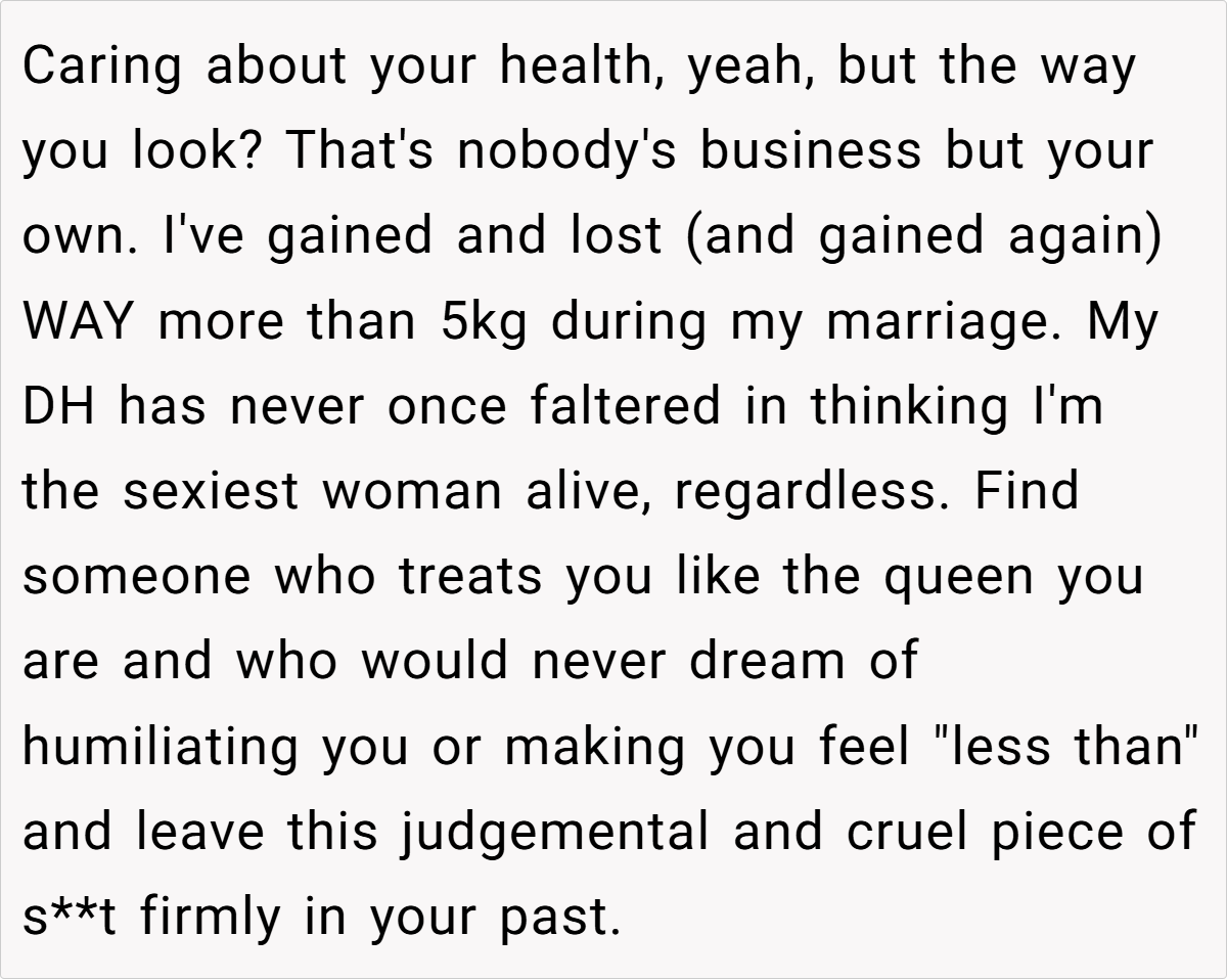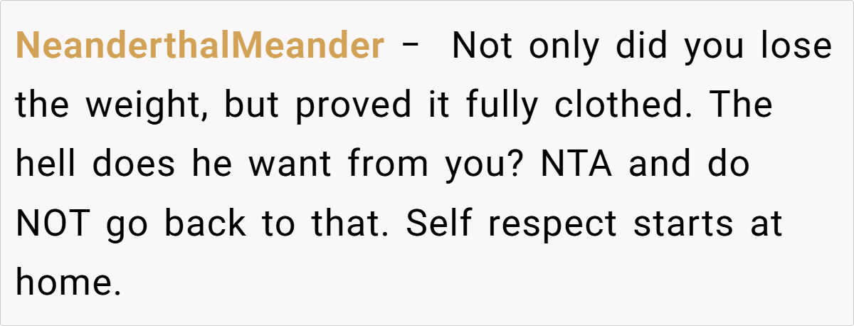 Many psychologists also stress that ultimatums based on personal attributes like weight are inherently manipulative. “Your body is your own, and no one should be forced to expose themselves as a test of trust,” notes relationship therapist Karen Mitchell. “It’s important to recognize when a partner’s demands are less about genuine care and more about imposing control.”